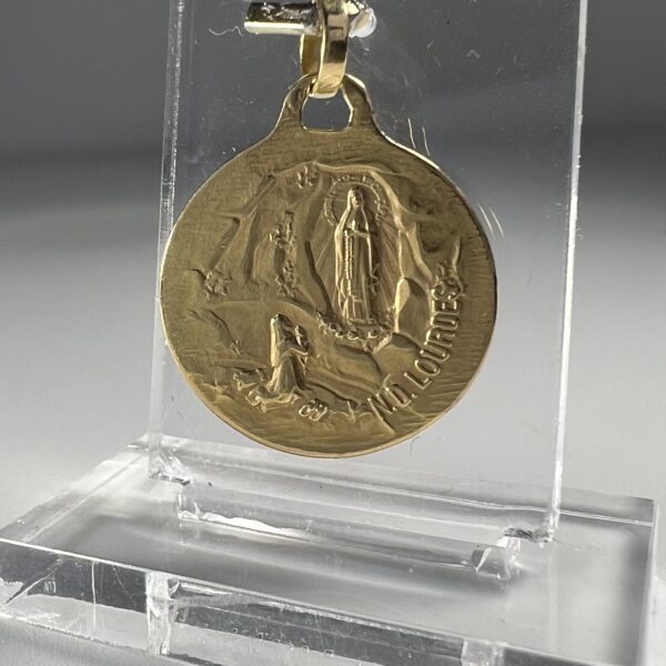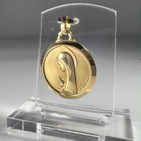 A.AUGIS. Médaille en or 18 carats, représentant la Vierge en prière. Signée. Au verso une représentation de Notre Dame de Lourdes. Une petite gravure est envisageable sur le coté gauche. Diamètre : 19 mm. Poids : 3,38 g.