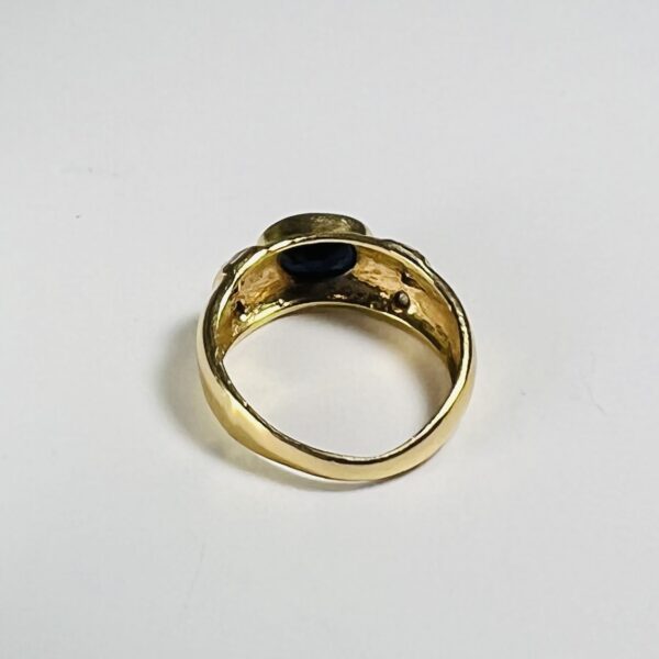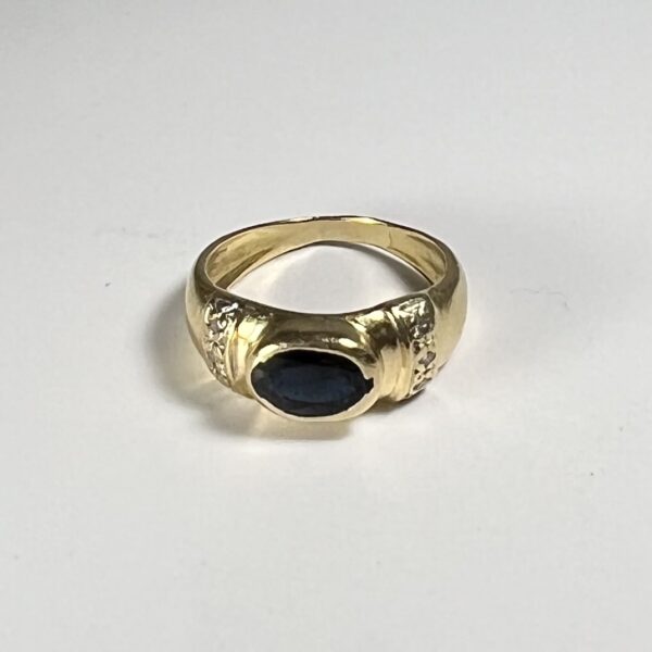 Bague de petit doigt en or jaune 18 carats, ornée d’un saphir en serti clos. La monture est rehaussée de petites roses. Tour de doigt : 45. Poids brut : 2,75 g