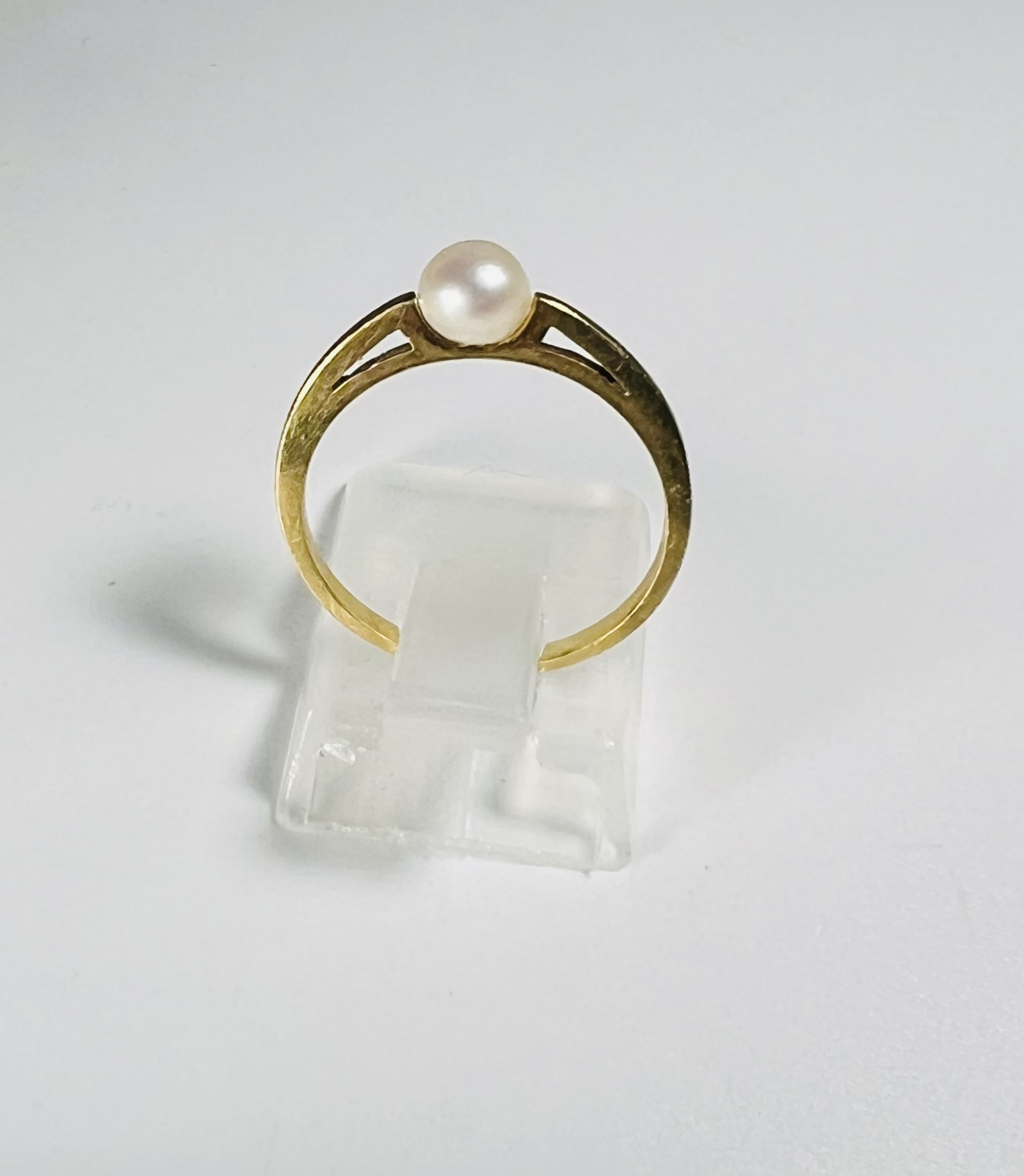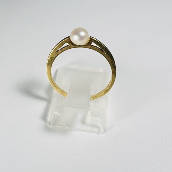 Bague ornée d’une perle de culture, dans une monture au profil ajouré. Tour de doigt : 51. Poids brut : 1,7 g