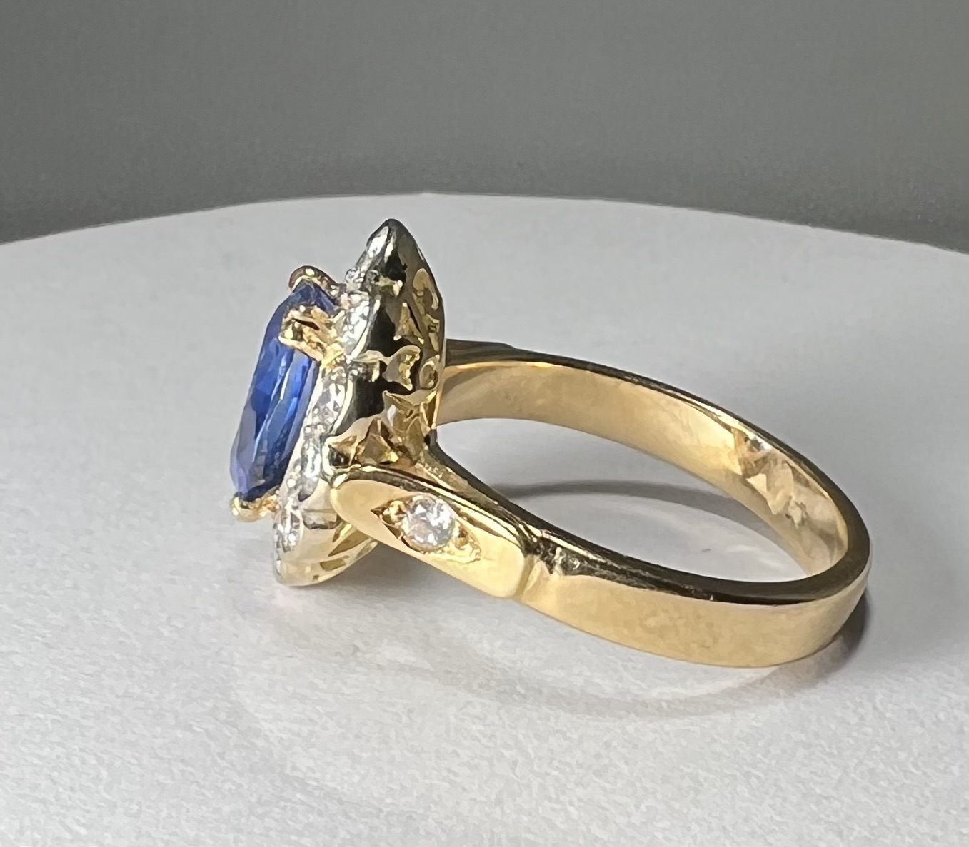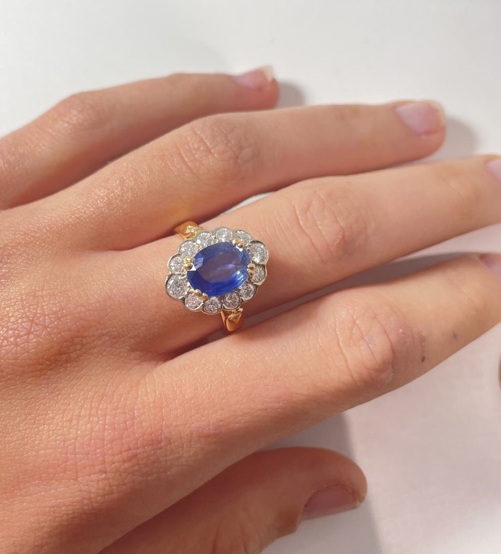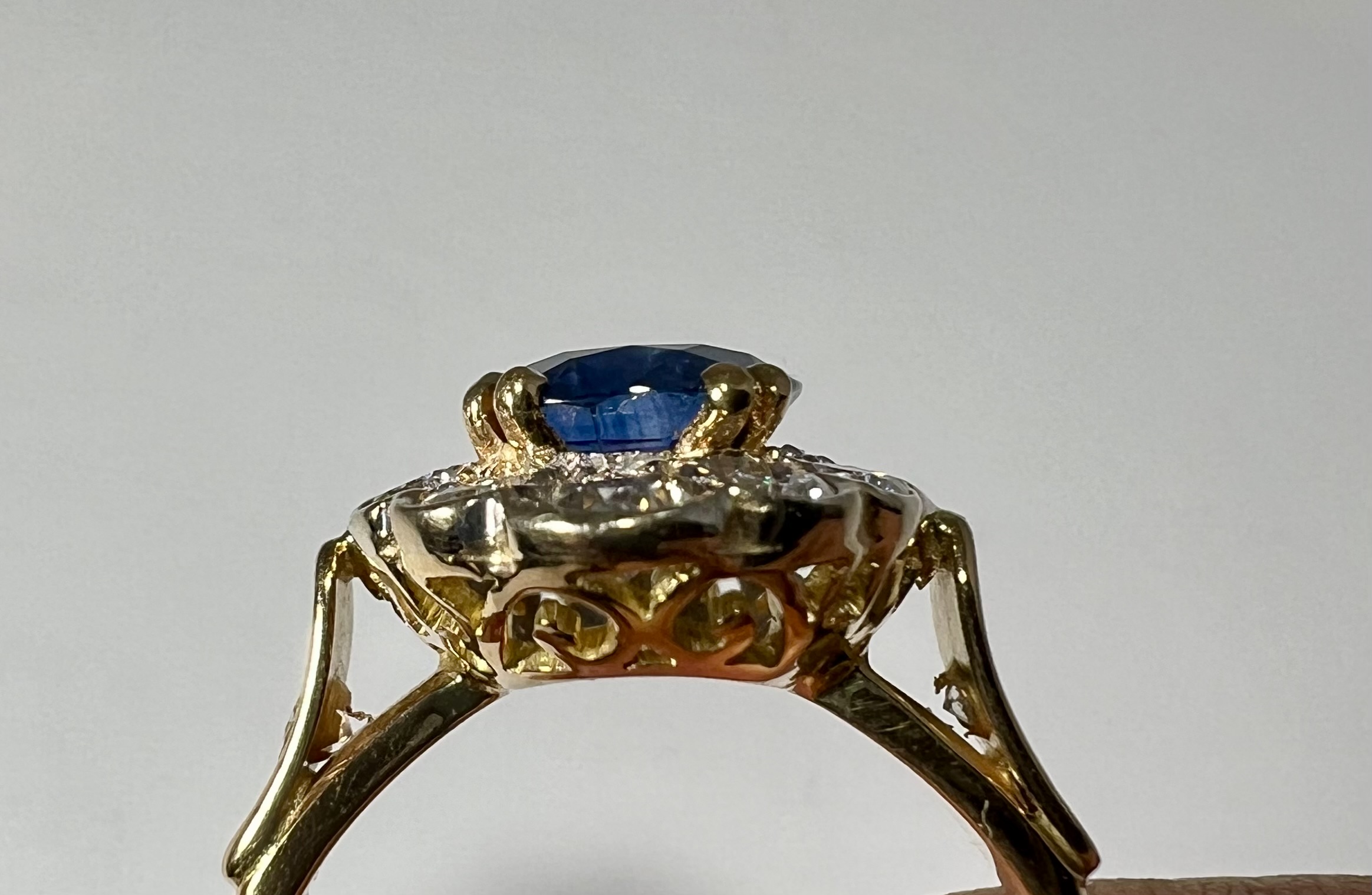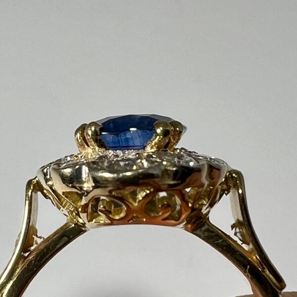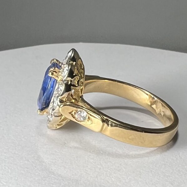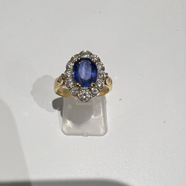 Bague en or jaune 18 Carats, sertie d’un beau saphir de Ceylan bleu profond, dans un entourage de diamants taille brillant en serti clos, dont deux plus importants aux extrémités. Panier joliment ajouré, anneau serti de deux petits diamants. Poids brut : 6,4 g. Tour de doigt : 55. Avec certificat préalable indiquant origine et traitement