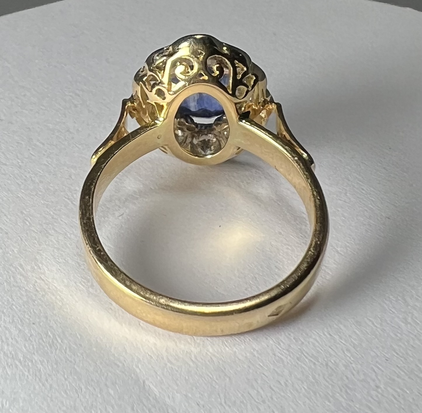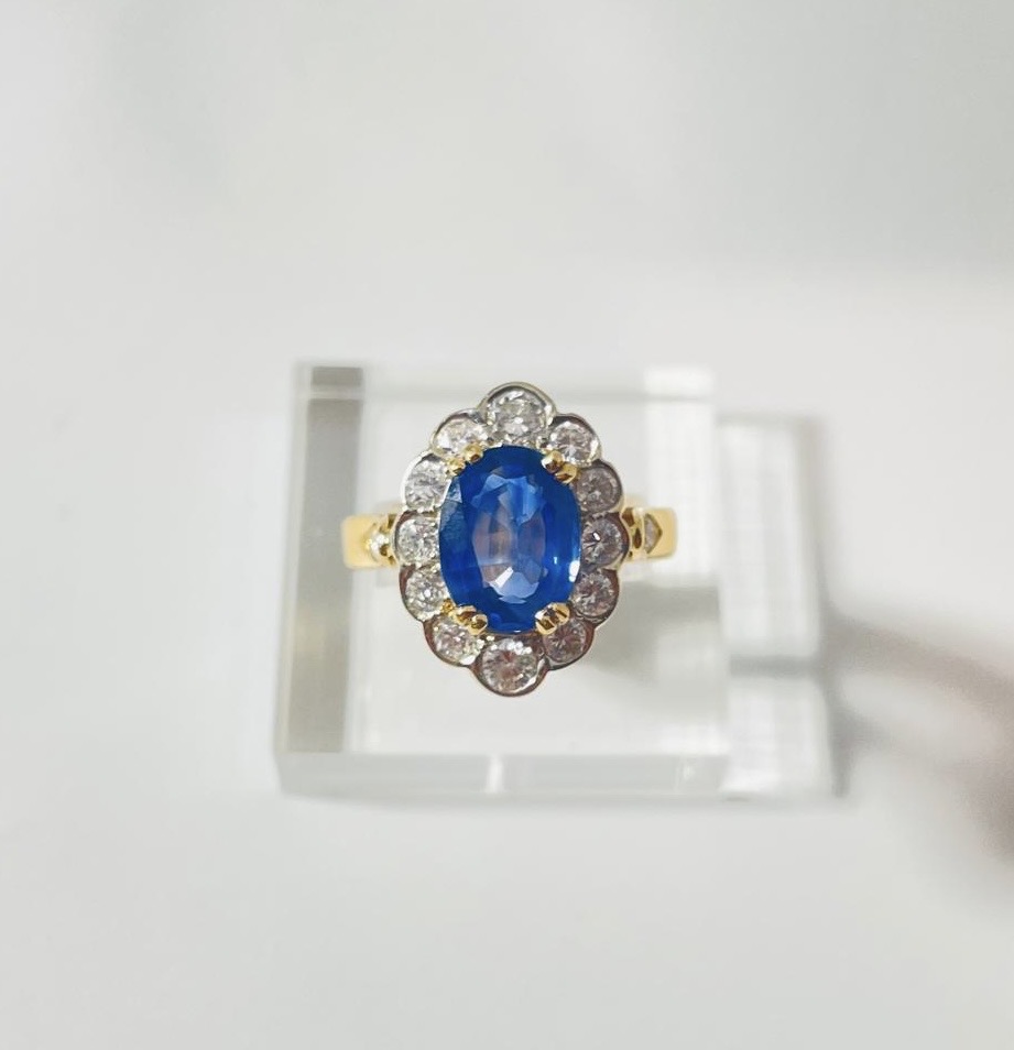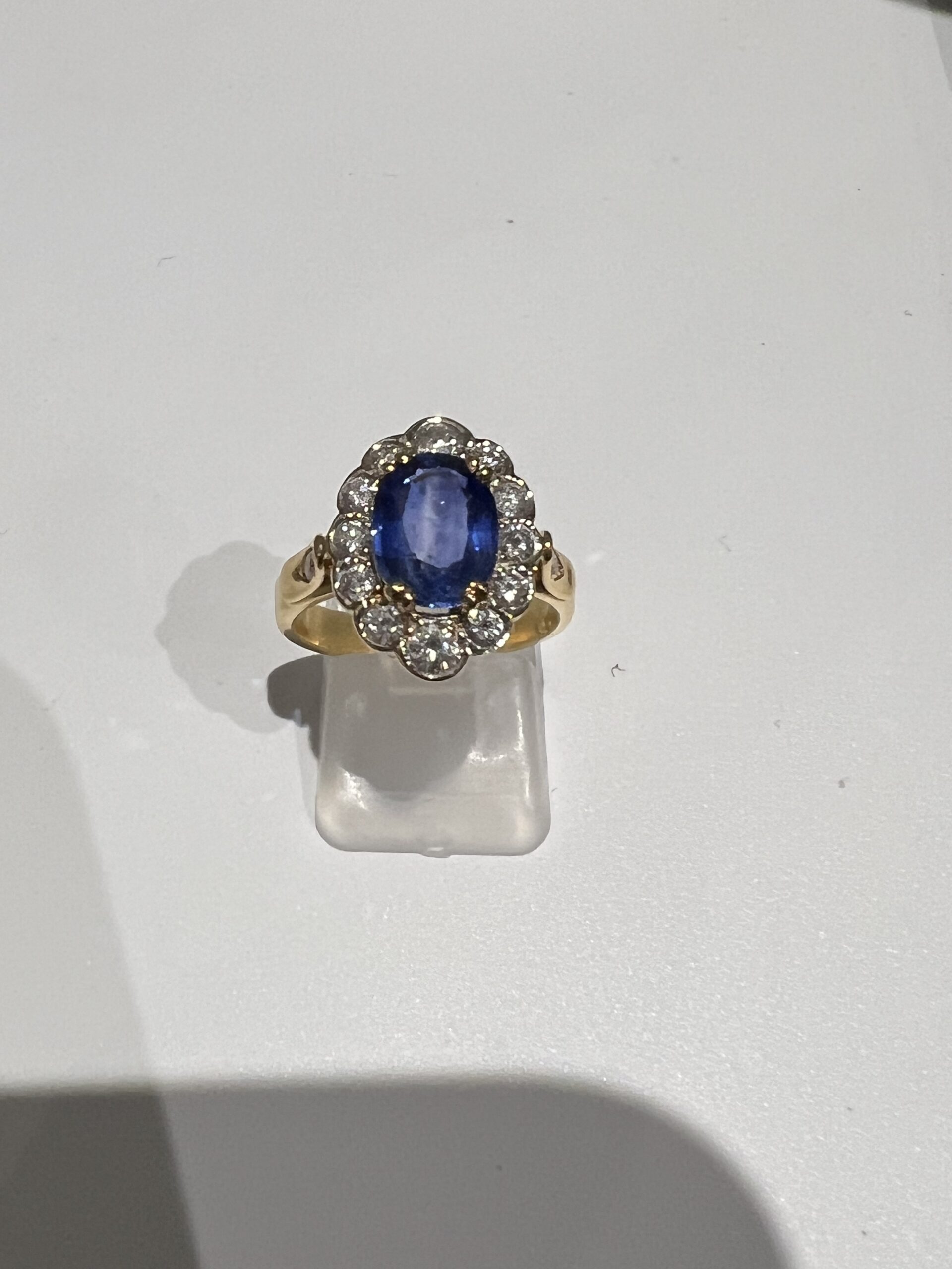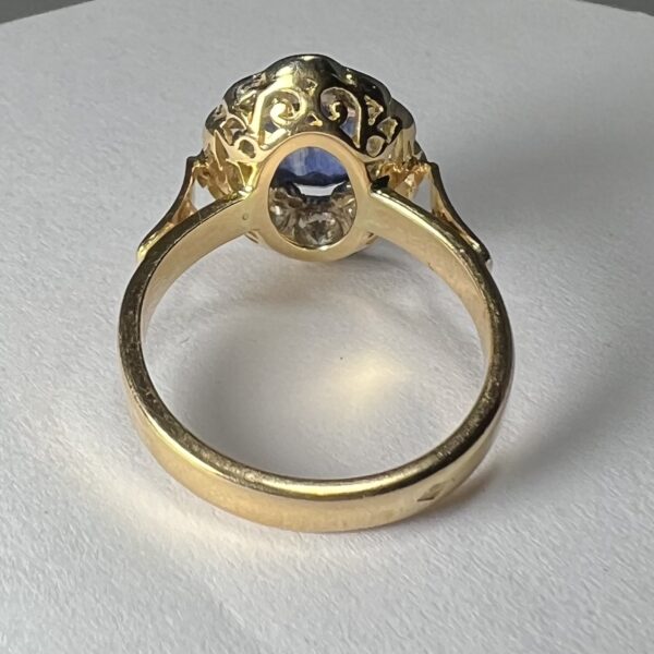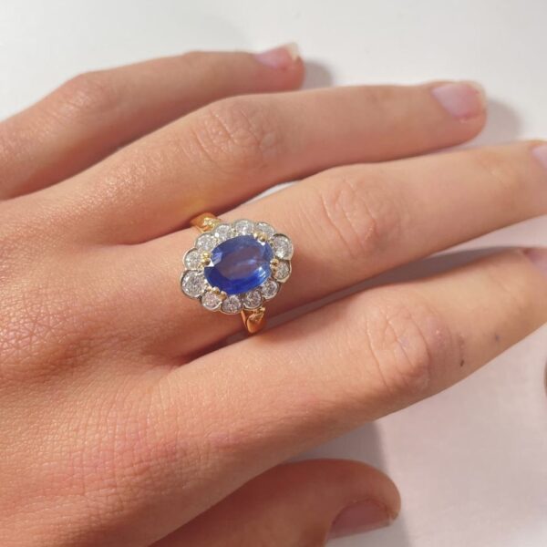 Bague en or jaune 18 Carats, sertie d’un beau saphir de Ceylan bleu profond, dans un entourage de diamants taille brillant en serti clos, dont deux plus importants aux extrémités. Panier joliment ajouré, anneau serti de deux petits diamants. Poids brut : 6,4 g. Tour de doigt : 55. Avec certificat préalable indiquant origine et traitement