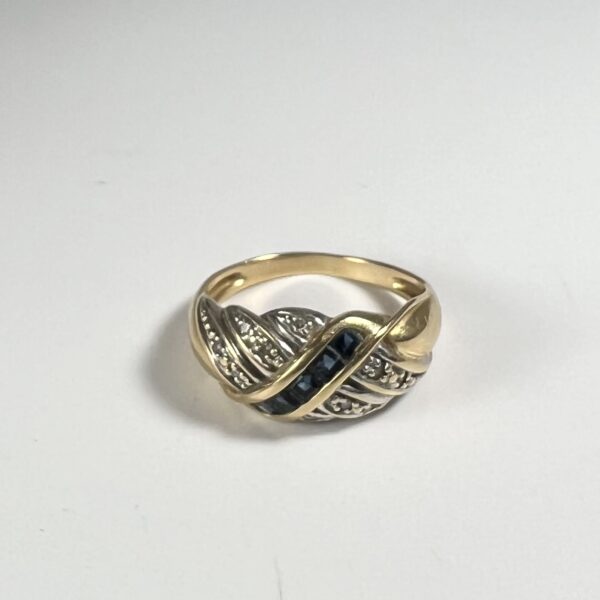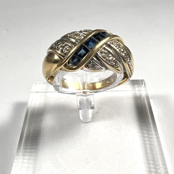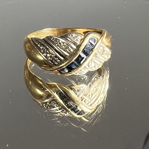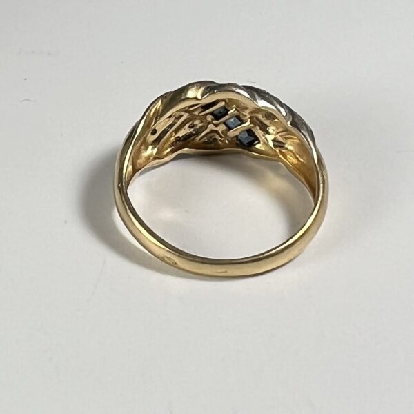 Bague en or jaune et or blanc 18 carats, sertie d’une ligne de saphirs calibrés, la monture rehaussée de petits diamants. Tour de doigt : 52. Poids brut : 3,44 g