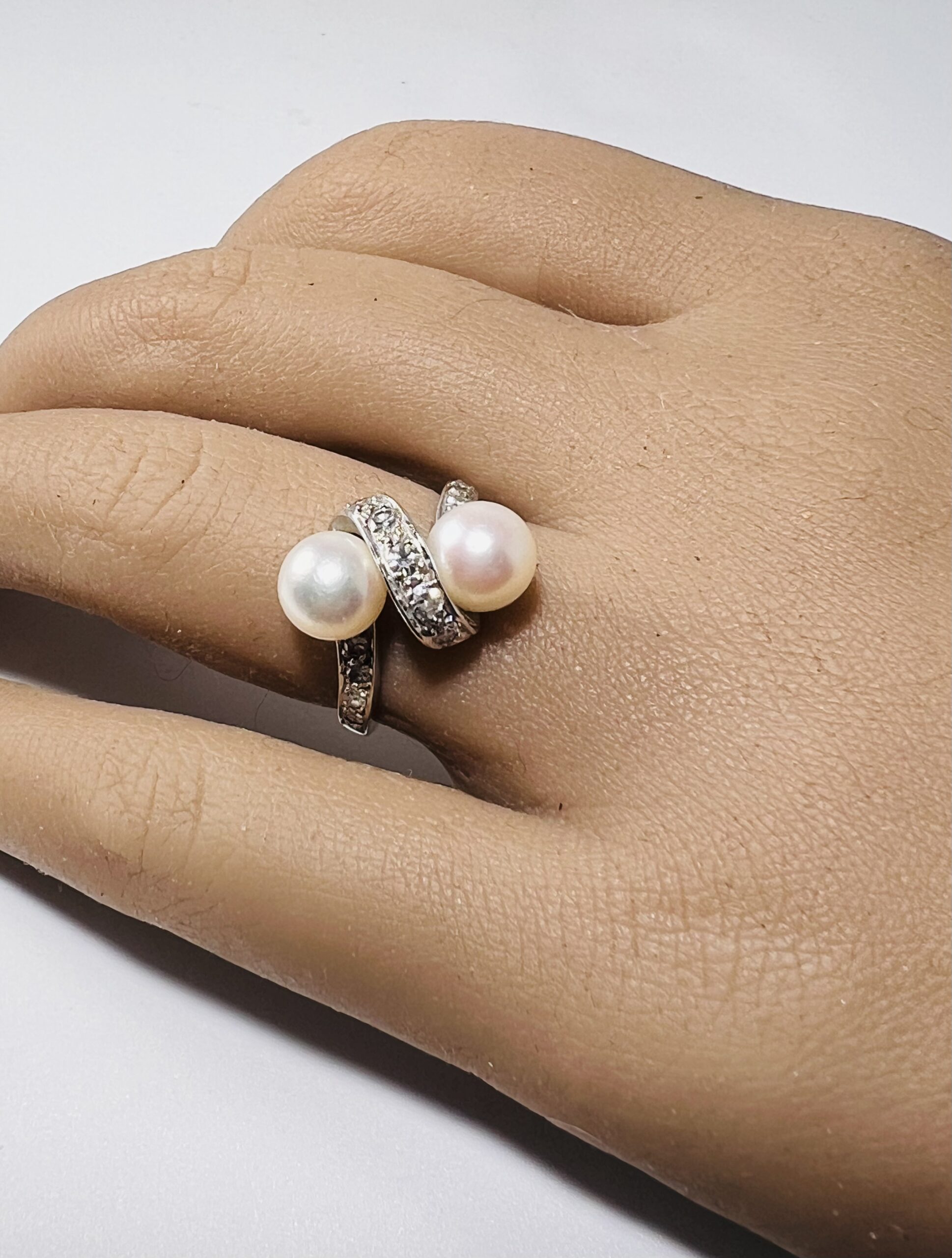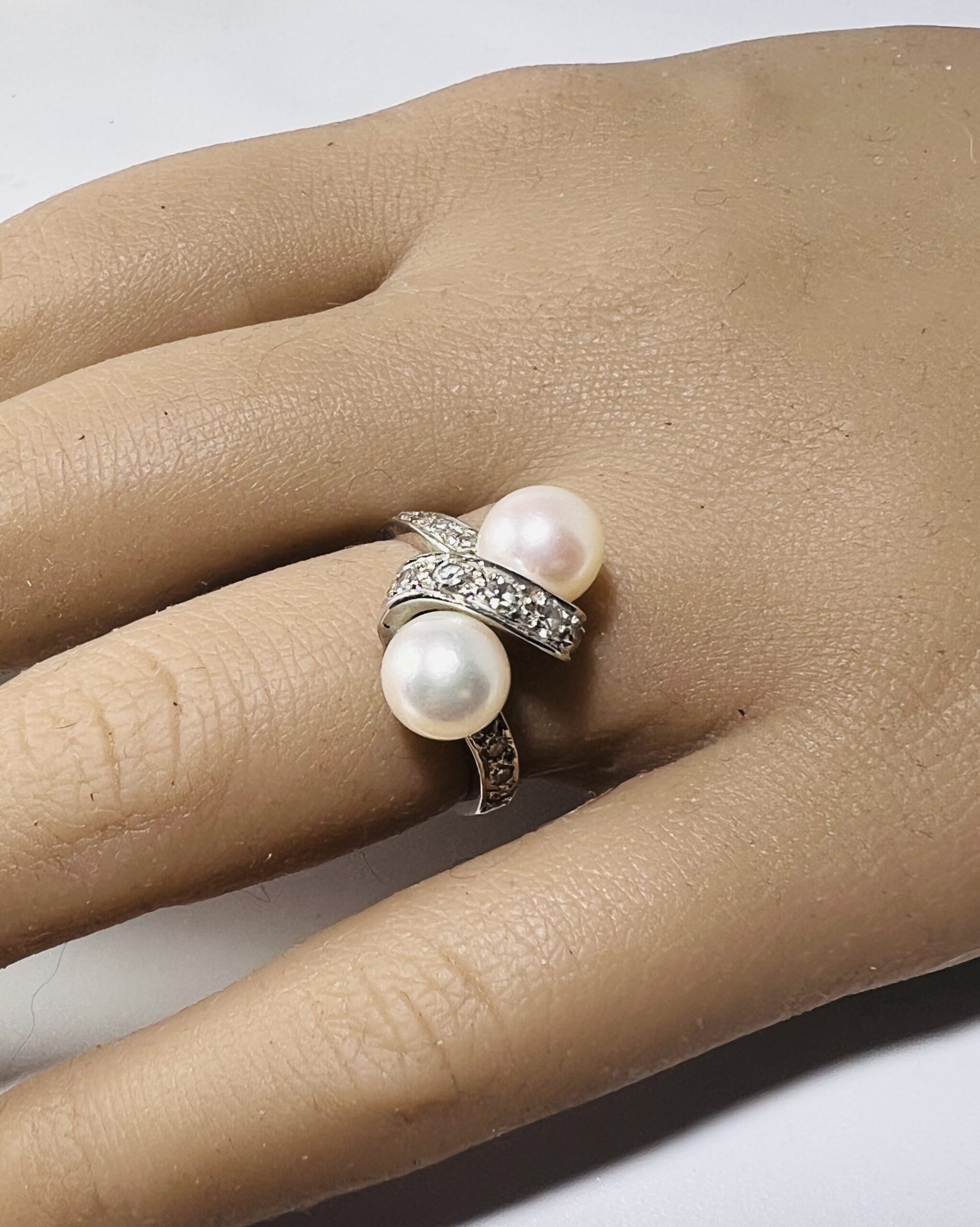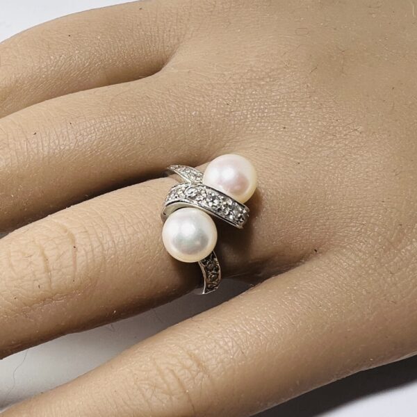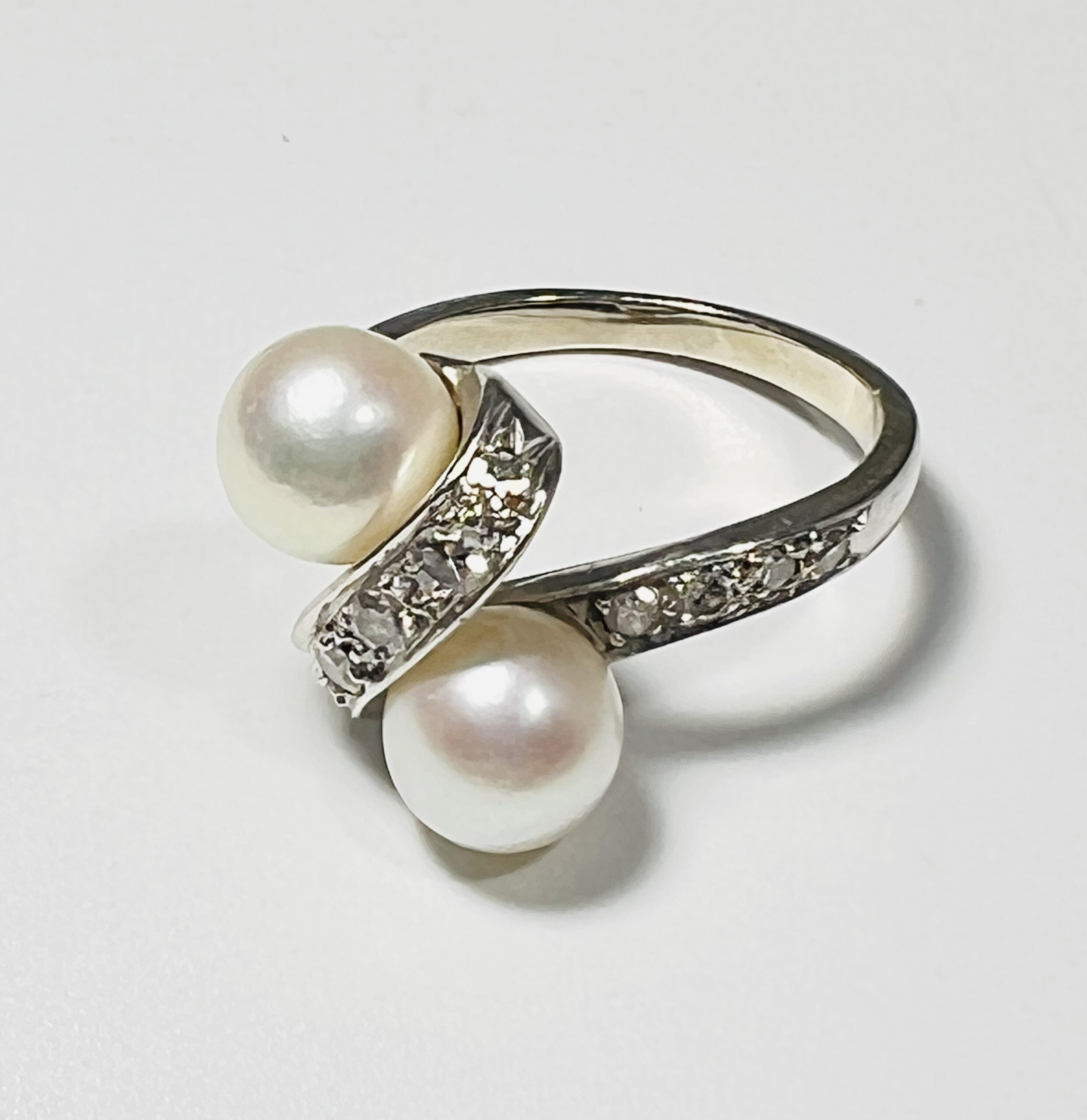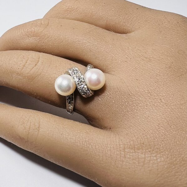 Bague Vous et Moi or gris 18 carats, sertie de deux perles de culture et de lignes de petits diamants. Diamètre des perles : 7,1 mm. Poids brut : 4,7 grammes. Tour de doigt 51/52