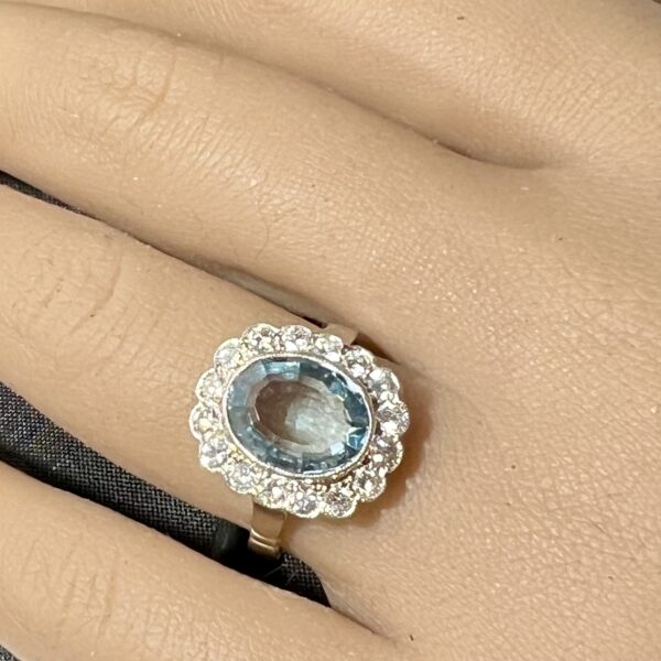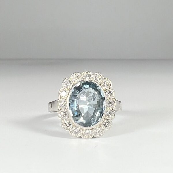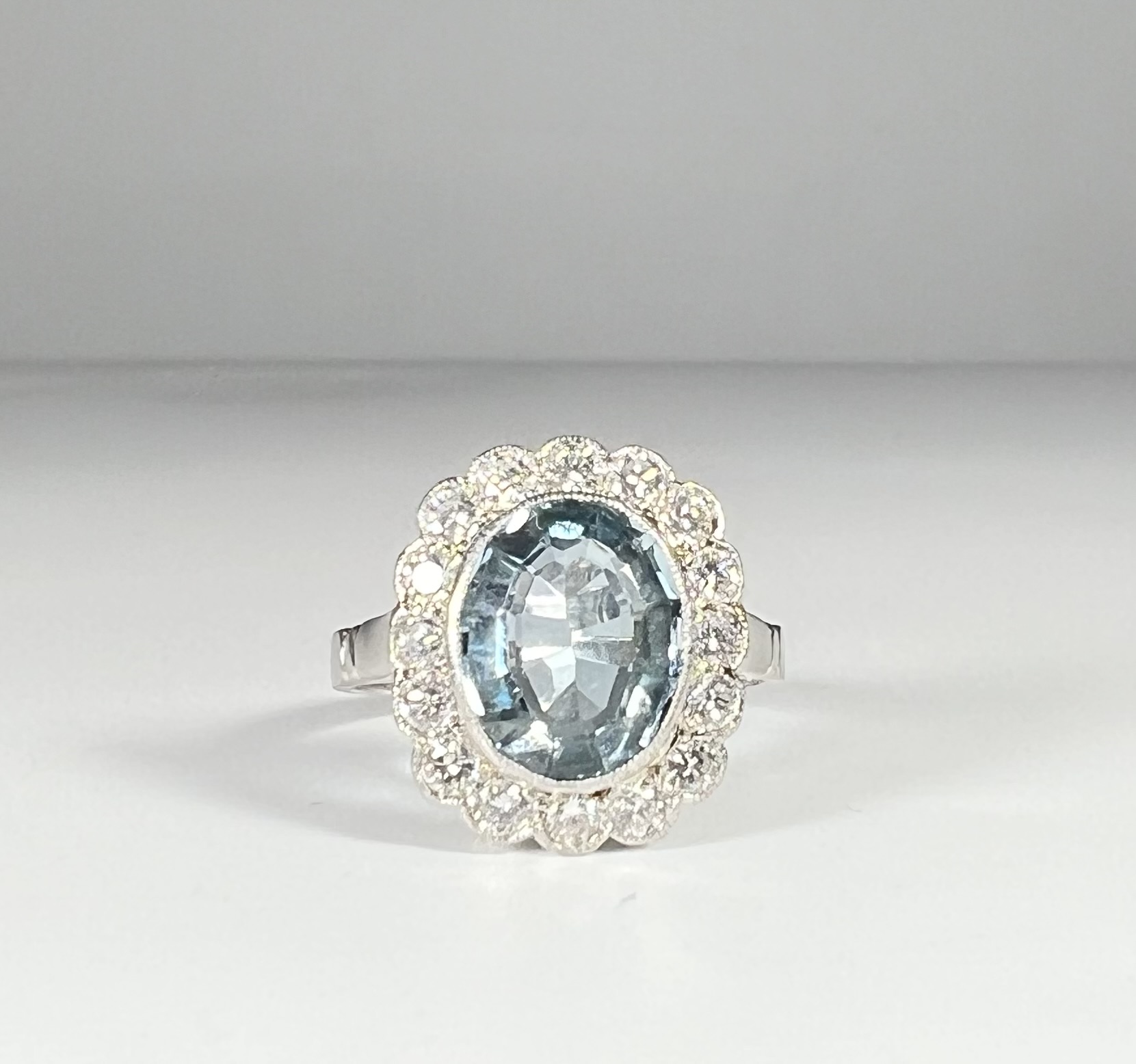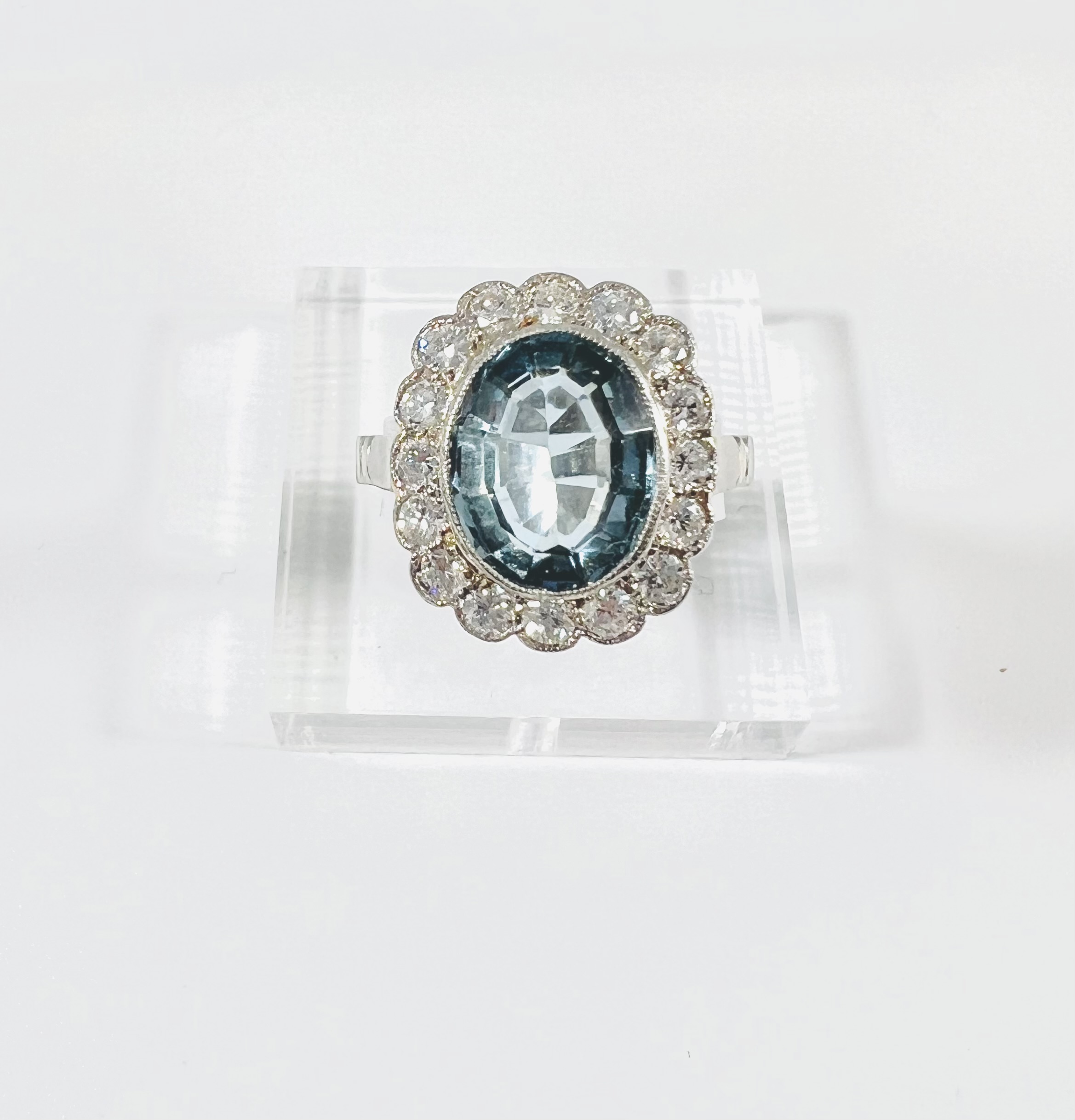 Belle bague marguerite en platine, ornée d’une topaze d’environ 2,20 carat, dans un entourage de diamants taille brillant, l’ensemble en serti clos. Poids brut : 5 g. Tour de doigt : 56