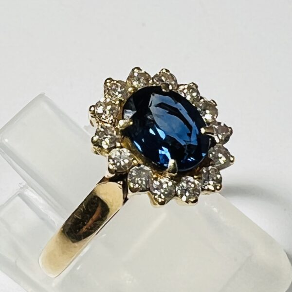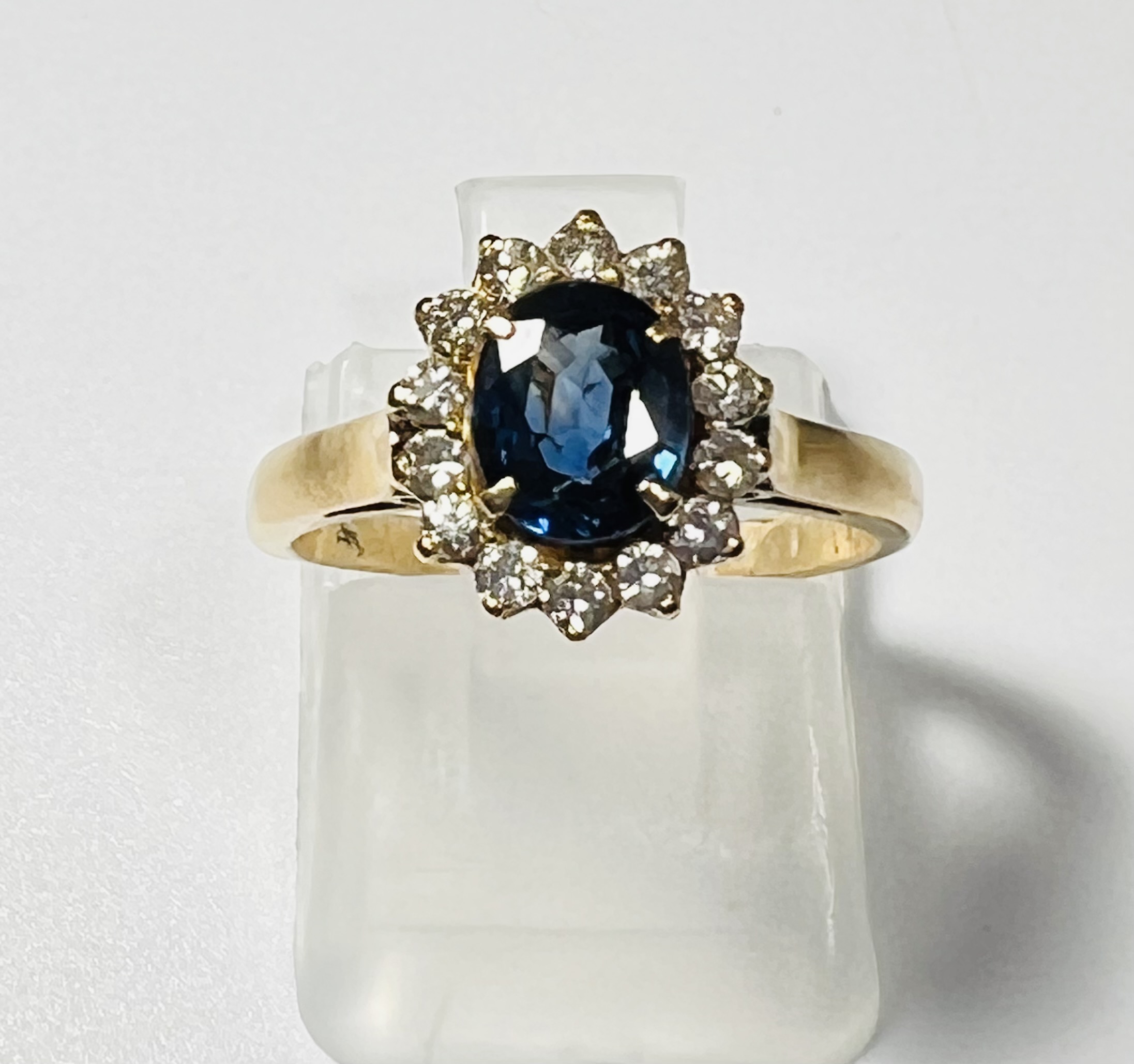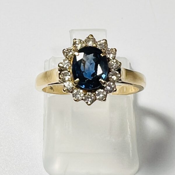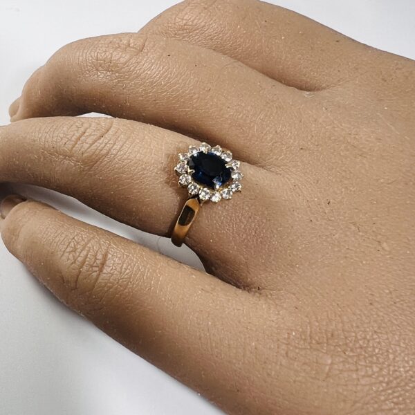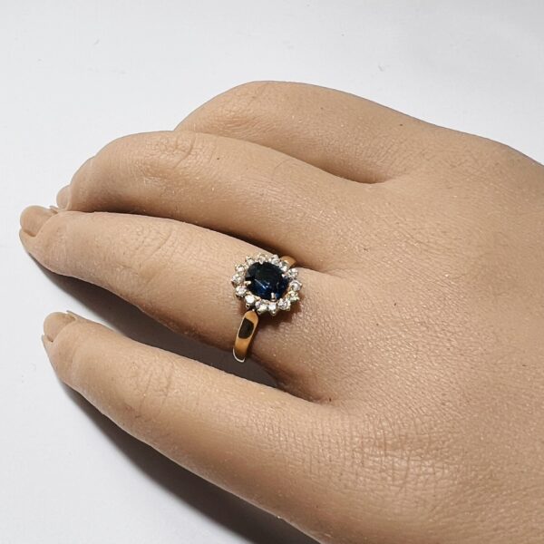 Bague marguerite en or jaune 18 carats, ornée d’un saphir dans un entourage de diamants taillle 8/8. Poids brut : 2,9 g. Tour de doigt : 47