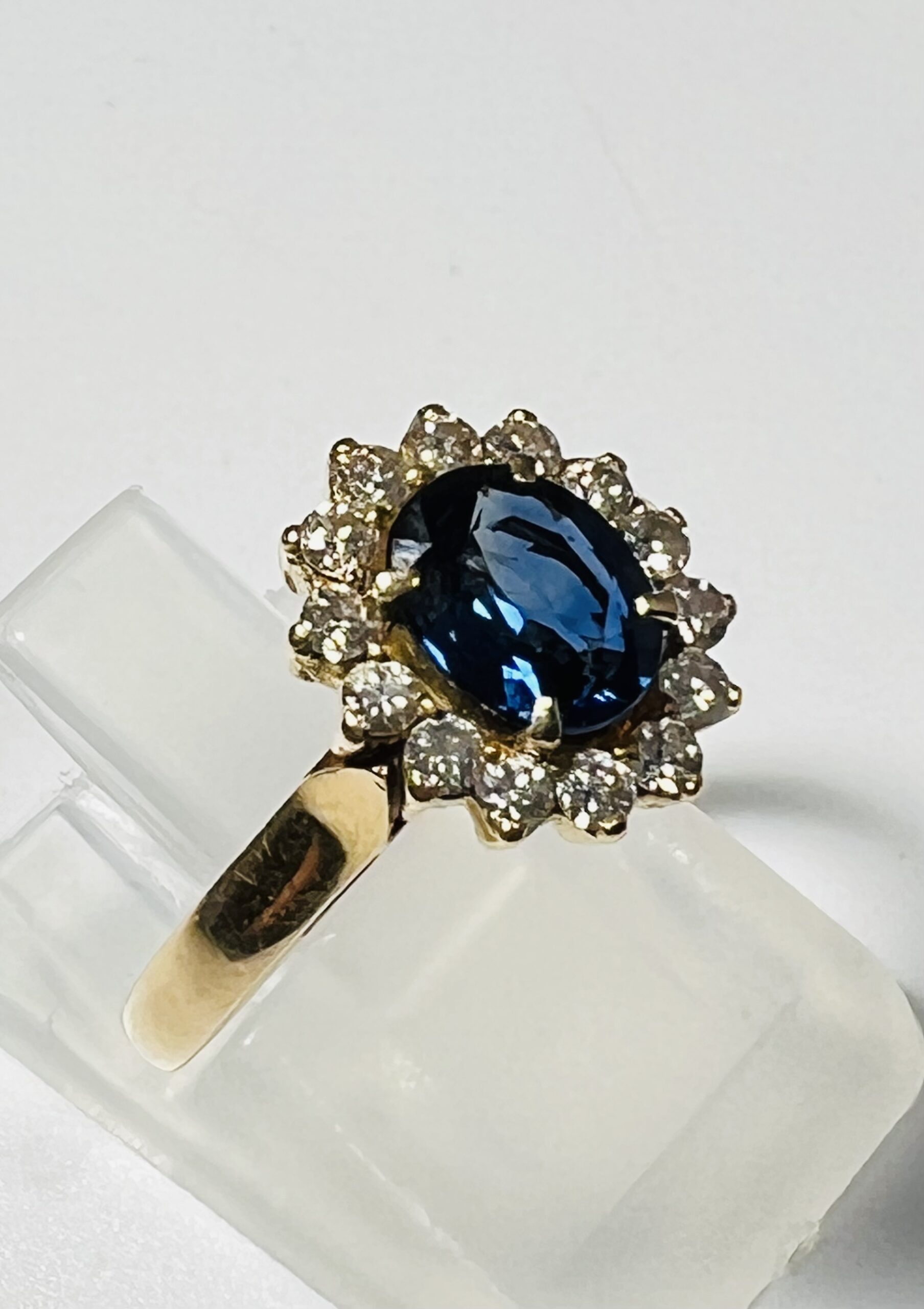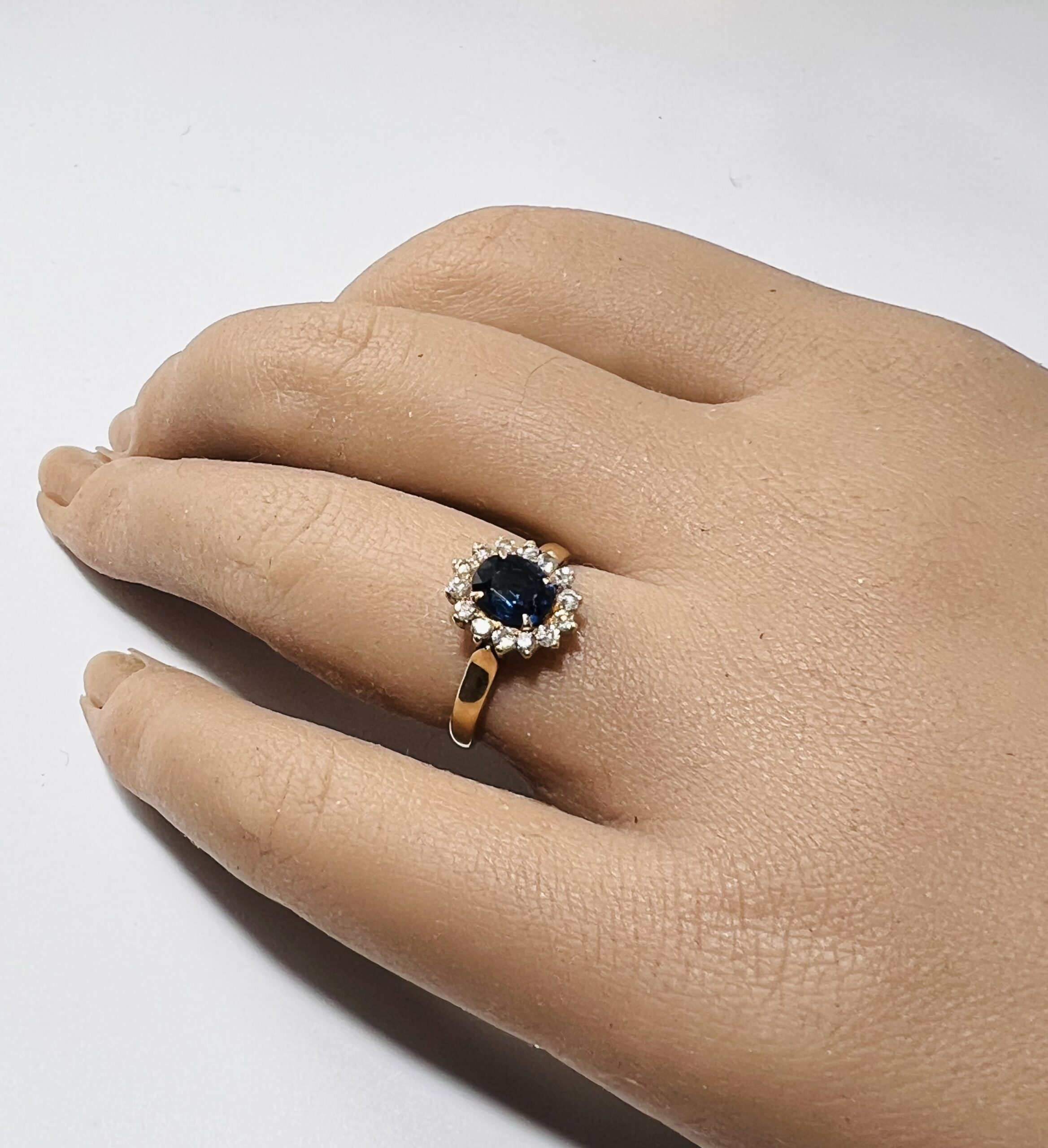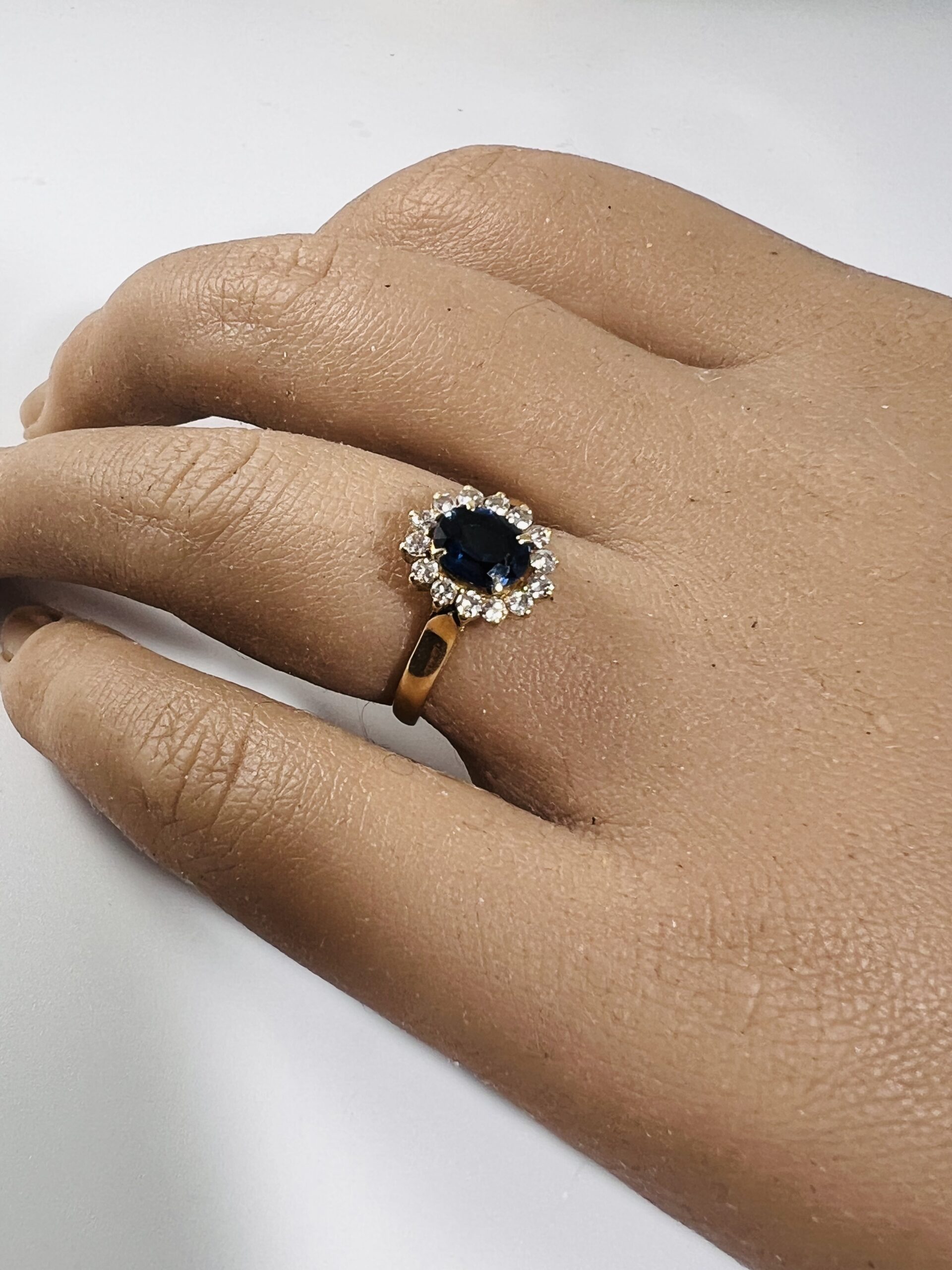 Bague marguerite en or jaune 18 carats, ornée d’un saphir dans un entourage de diamants taillle 8/8. Poids brut : 2,9 g. Tour de doigt : 47