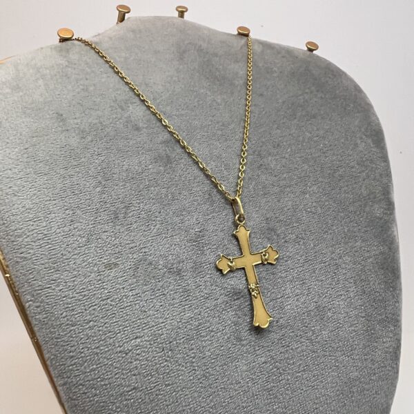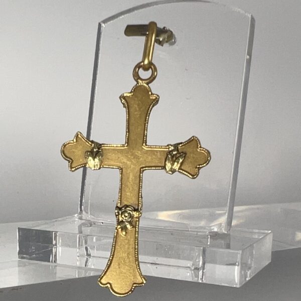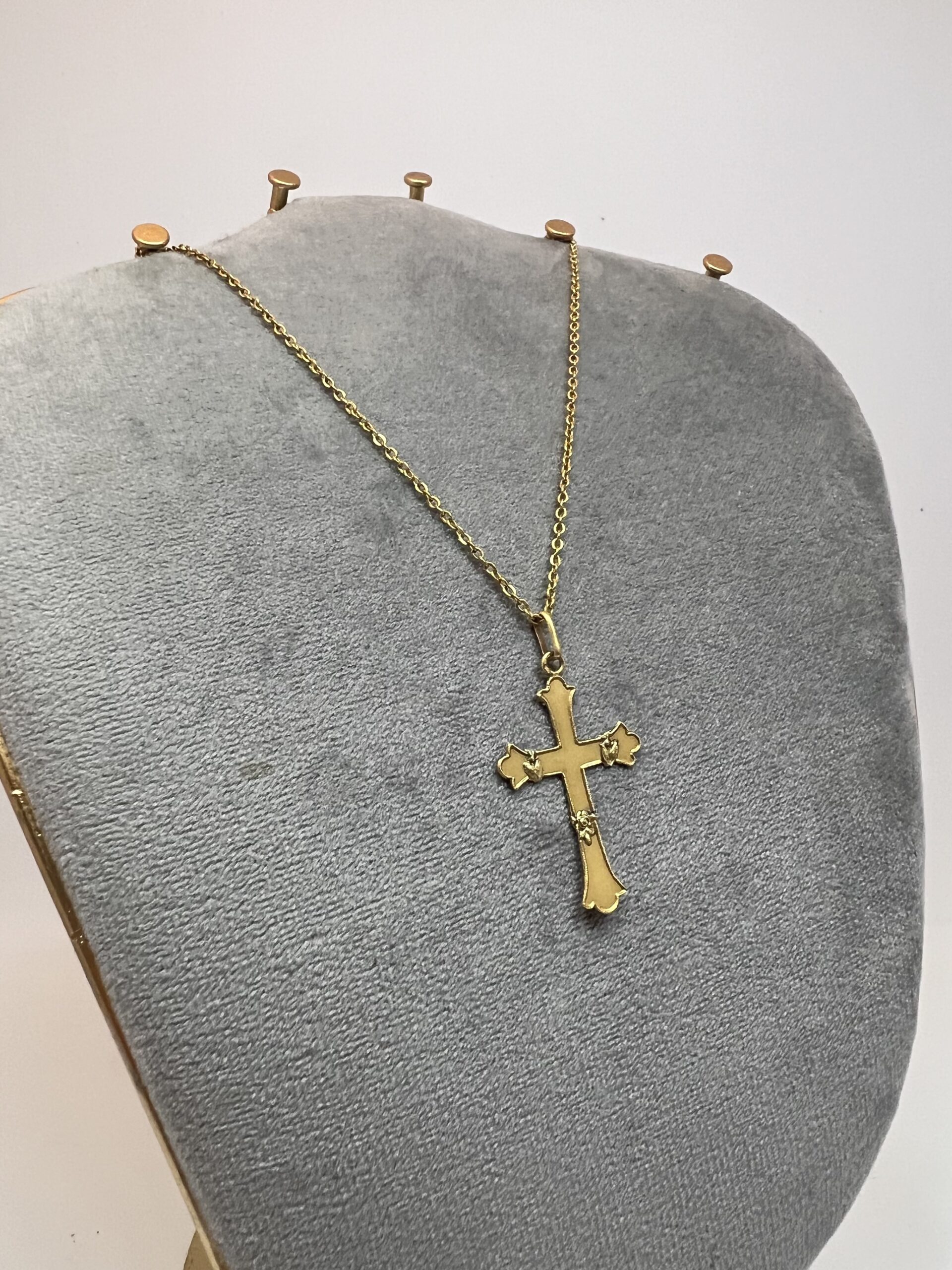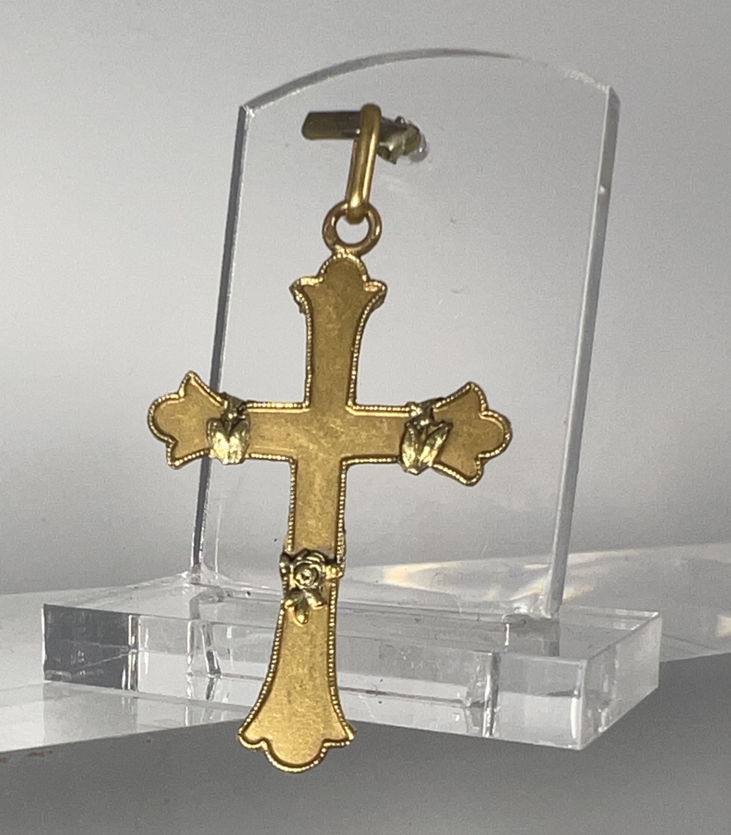 Fine croix ancienne en or 18 carats, l’extrémité des branches trilobées, et décorées de fleurs. Dimensions sans la bélière : 35 mm. Poids : 1 g
