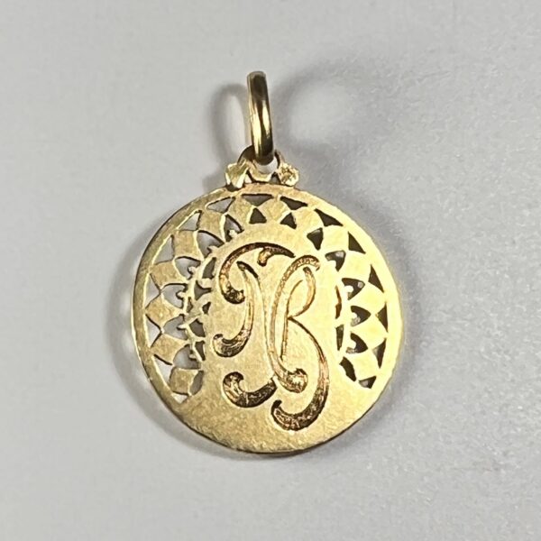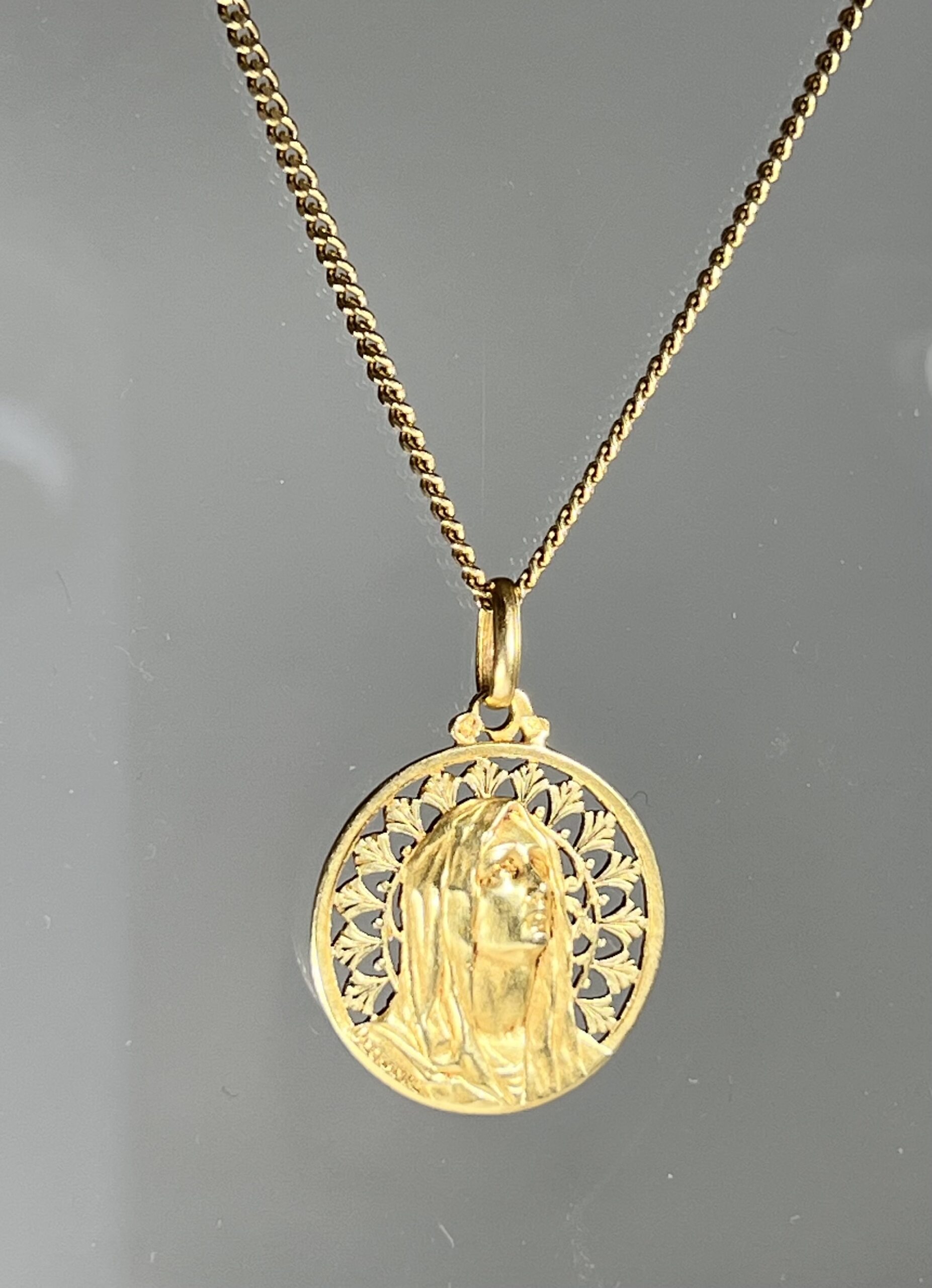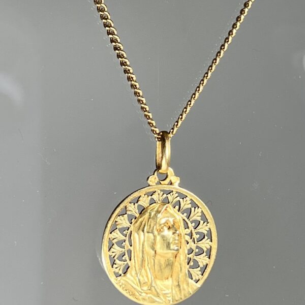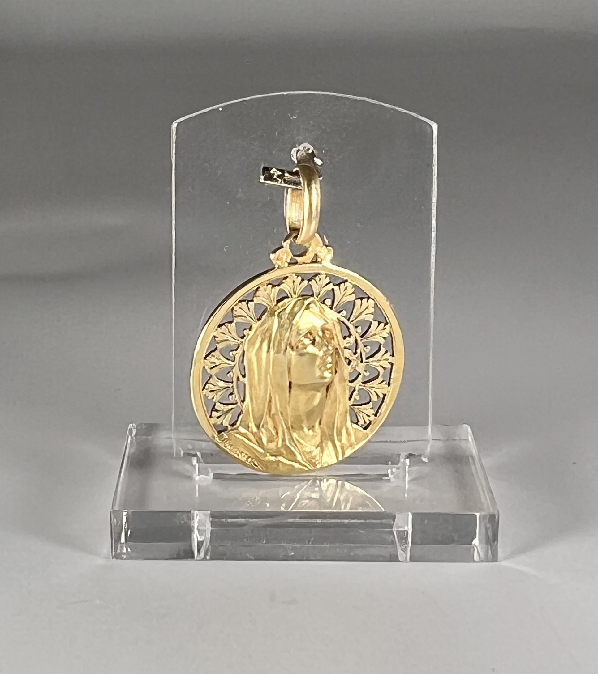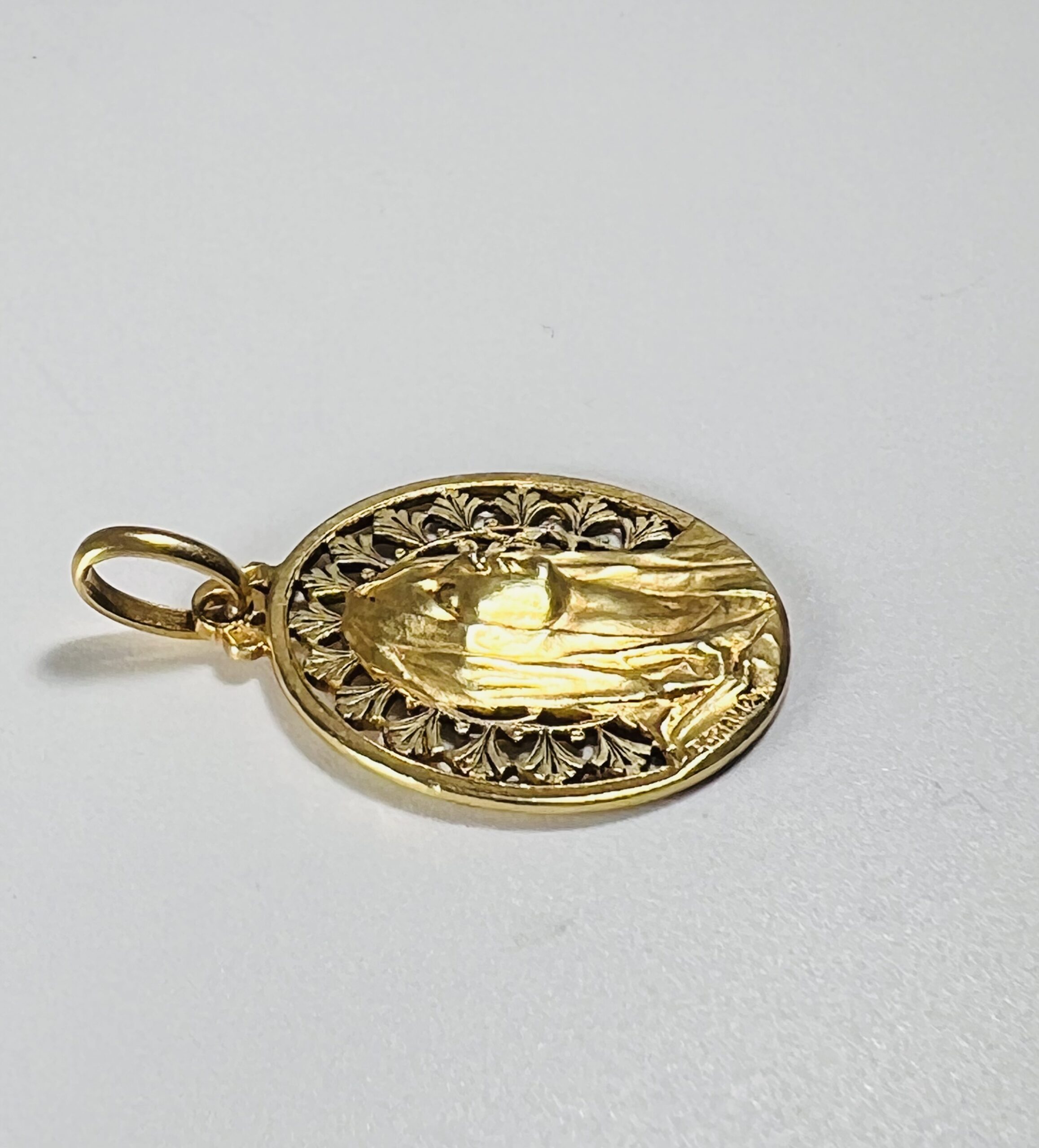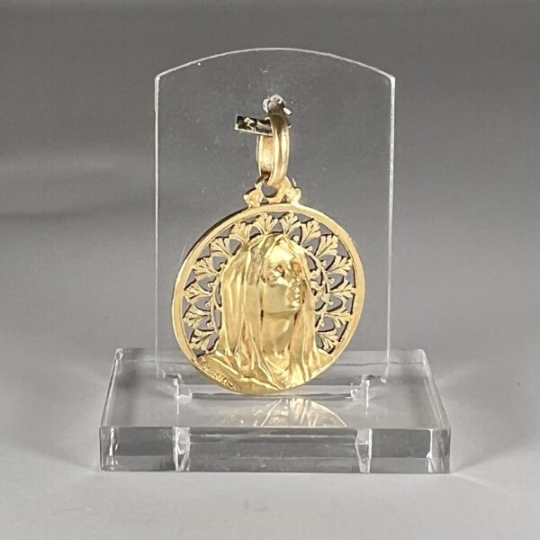 DECHAMPS. Médaille en or 18 carats représentant la Vierge de 3/4, dans un entourage ajouré et feuillagé. Monogrammée au verso MB. Diamètre : 21 mm. Poids : 4 g