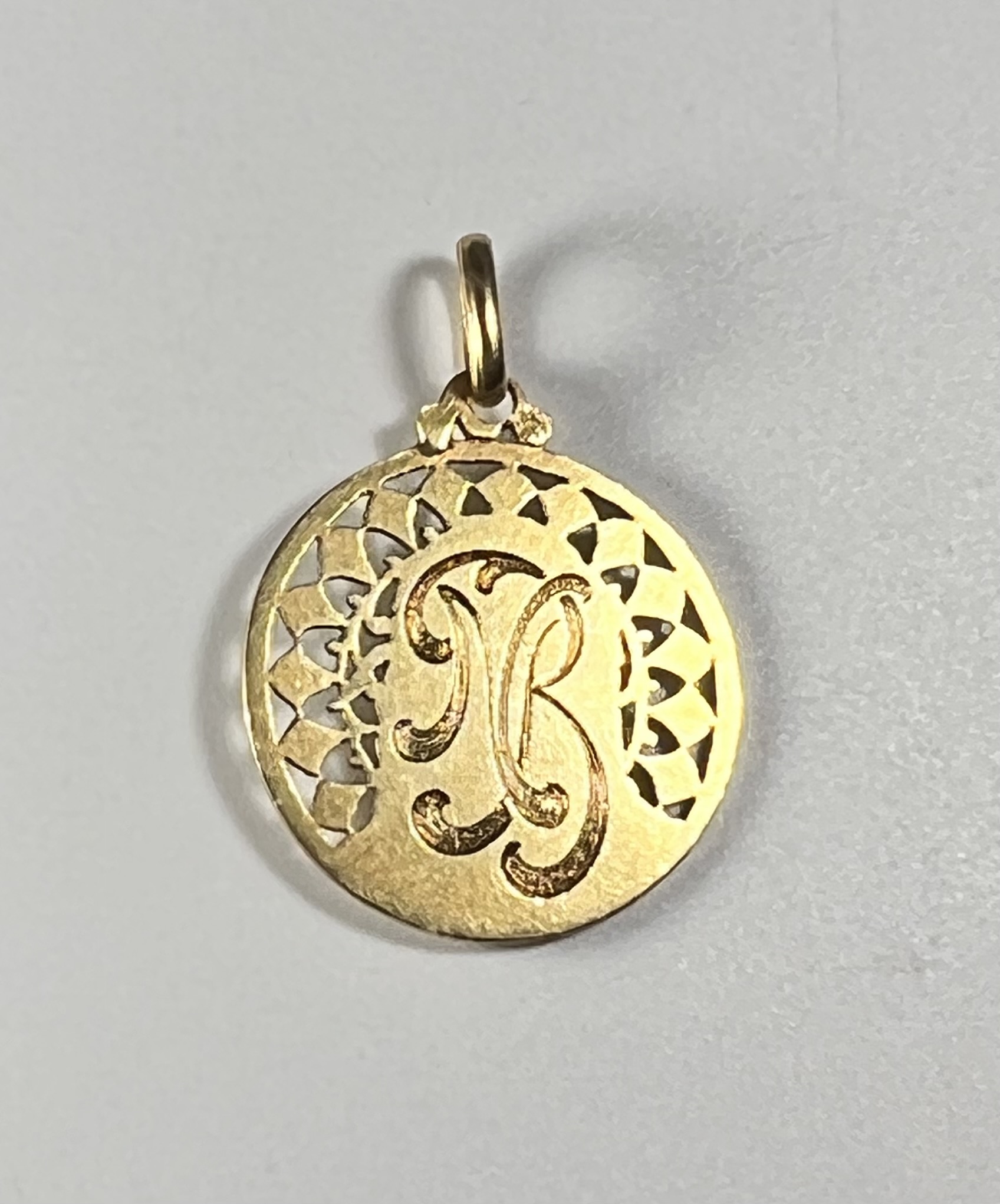 + Frais de livraisonDECHAMPS. Médaille en or 18 carats représentant la Vierge de 3/4, dans un entourage ajouré et feuillagé. Monogrammée au verso MB. Diamètre : 21 mm. Poids : 4 g