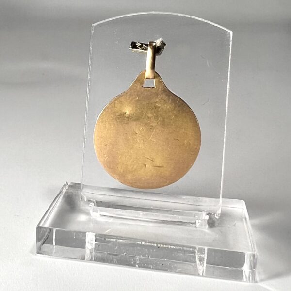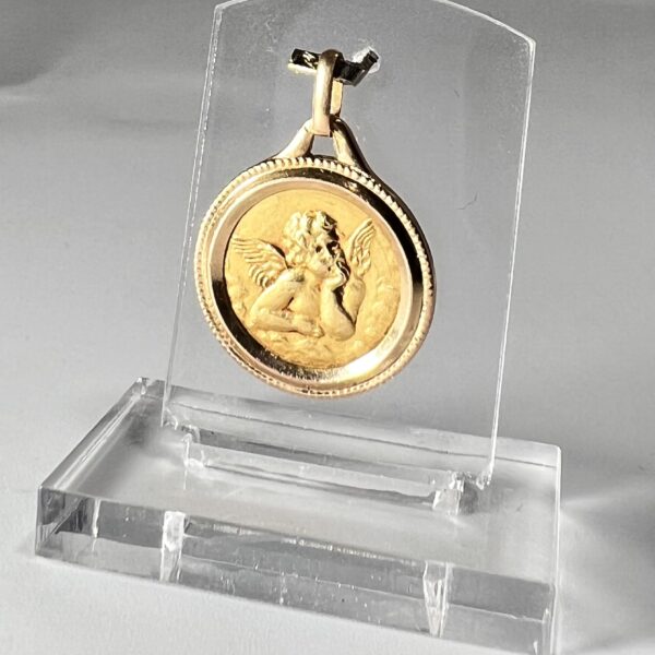 Médaille en or 18 carats représentant un ange dans un double entourage lisse et perlé. Diamètre : 18 mm. Poids : 2 g (légers enfoncements au verso)