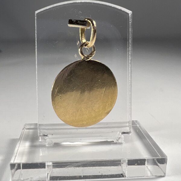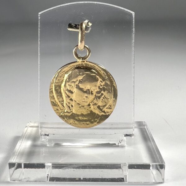 Médaille en or 18 carats, à décor de la Vierge. Diamètre sans la bélière : 18 mm. Poids : 2,96 g. Cette médaille était portée sur un bracelet, la bélière est un peu plus grande qu’habituellement. Possibilité de la changer sur demande.