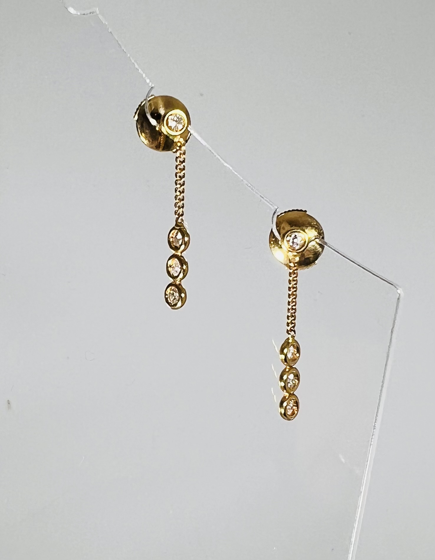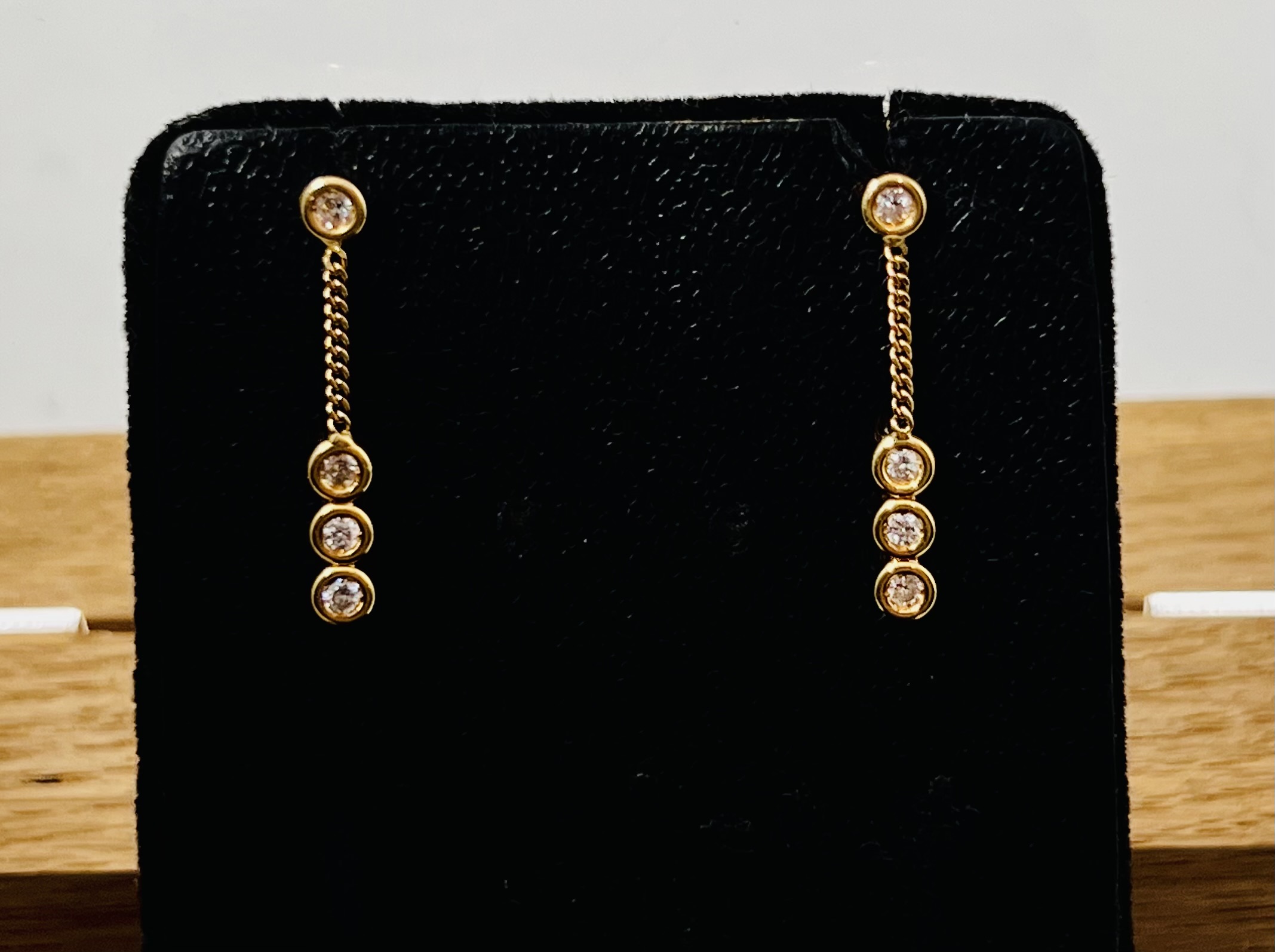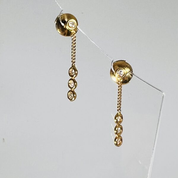 + Frais de livraisonPaire de pendants d’oreilles en or 18 carats, quatre petits diamants sertis clos, retenus par une fine chaîne. Fermoirs Alpa. Longueur : 25 mm. Poids brut : 2,23 g.