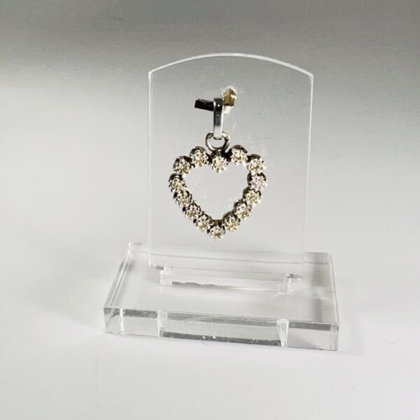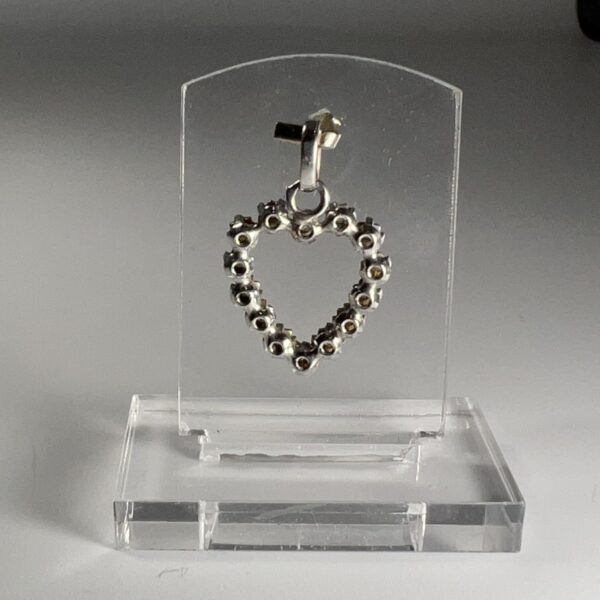 Petit pendentif en forme de cœur en or blanc 18 carats, serti de petits diamants taillés en rose. Hauteur sans la bélière : 18 mm. Largeur : 15 mm. Poids brut : 1,54 g