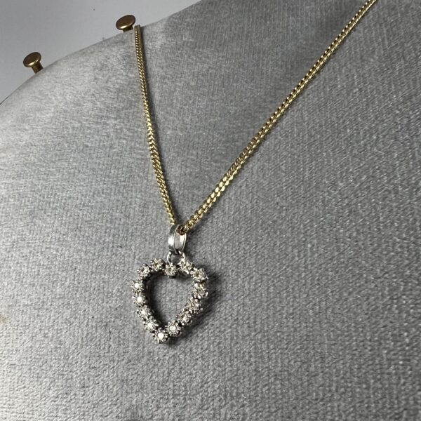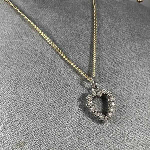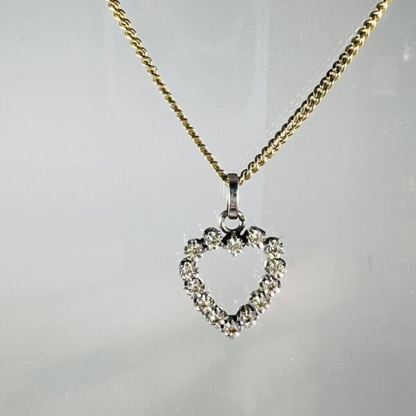 + Frais de livraisonPetit pendentif en forme de cœur en or blanc 18 carats, serti de petits diamants taillés en rose. Hauteur sans la bélière : 18 mm. Largeur : 15 mm. Poids brut : 1,54 g