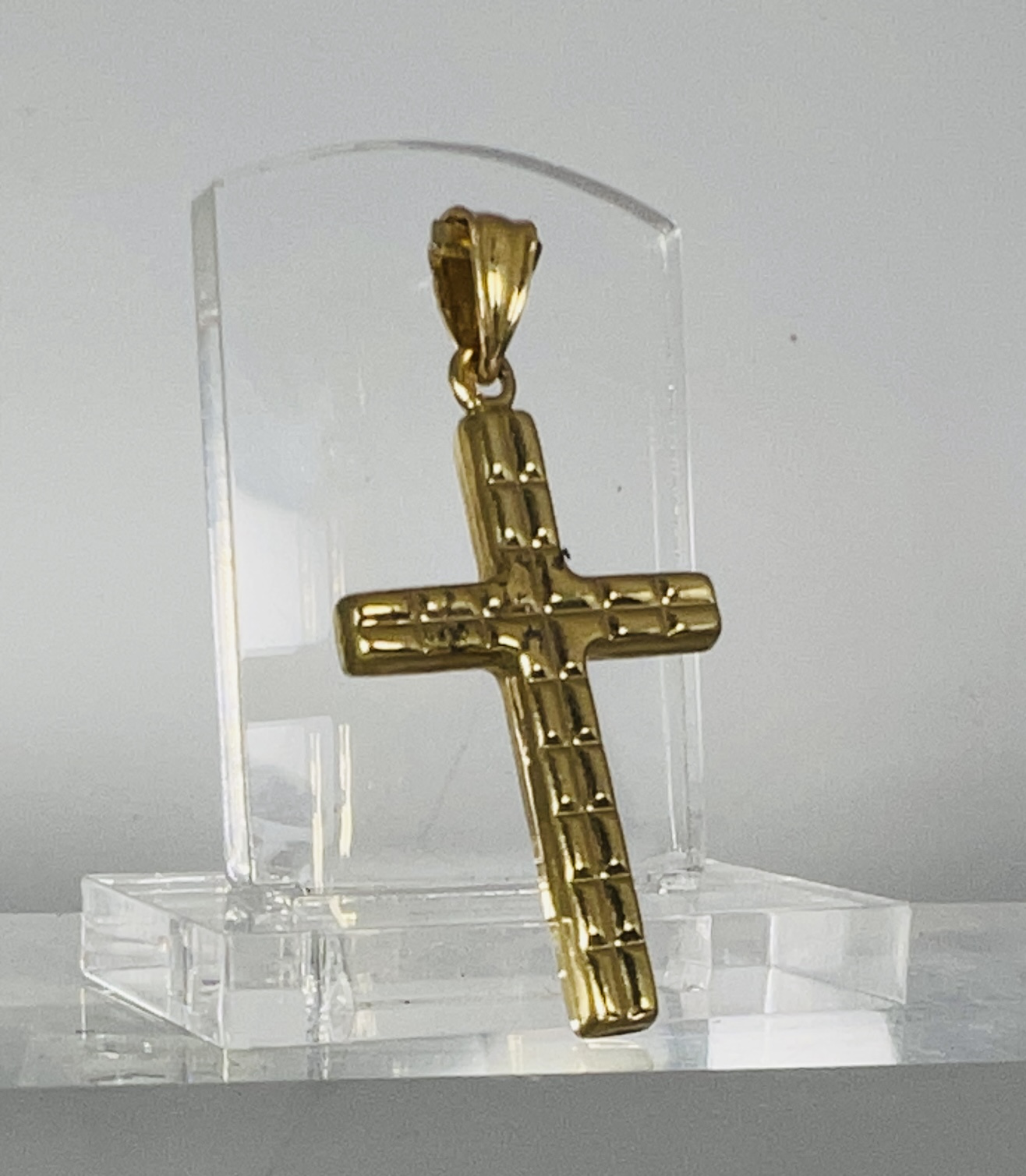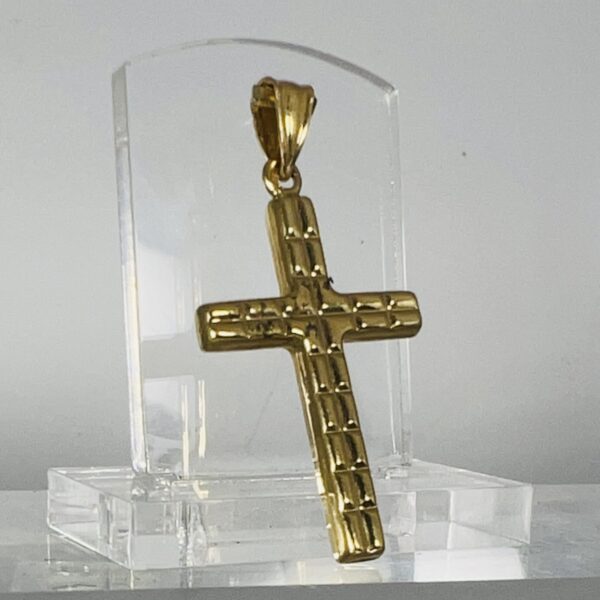 Croix en or 18 carats à décor en relief. Hauteur sans la bélière : 33 mm. Poids : 1,6 g