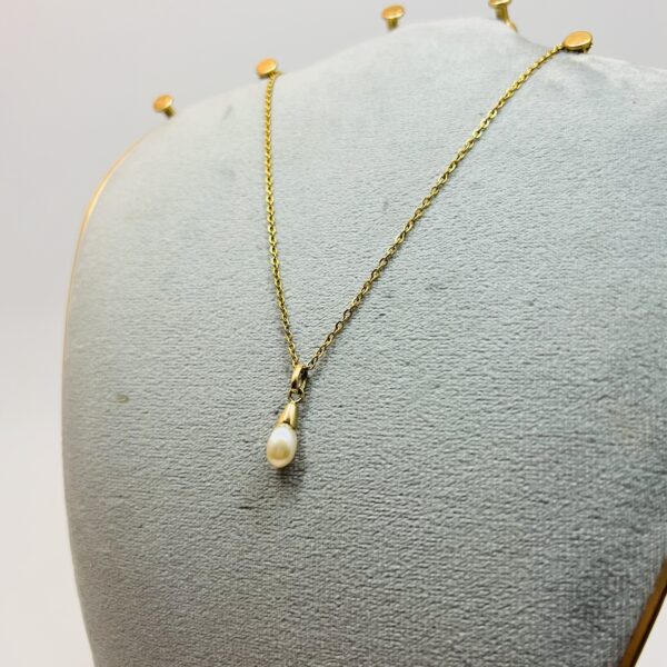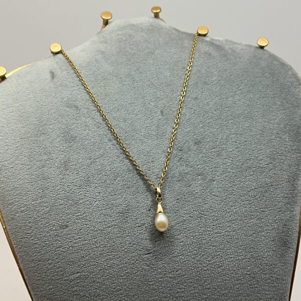 Pendeloque perle de forme baroque, monture en or jaune. Hauteur sans la bélière : 15 mm. Poids brut : 0,9 g