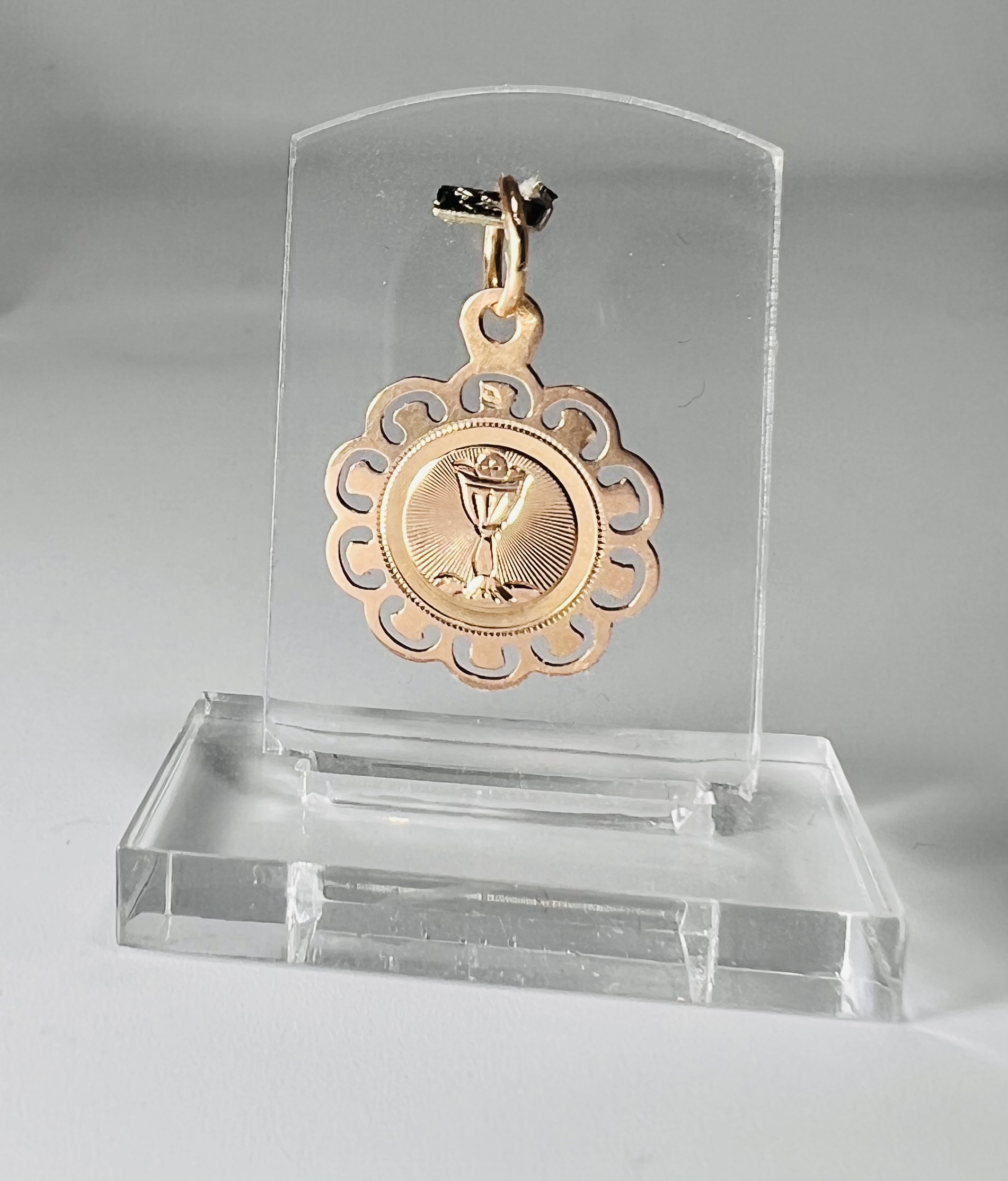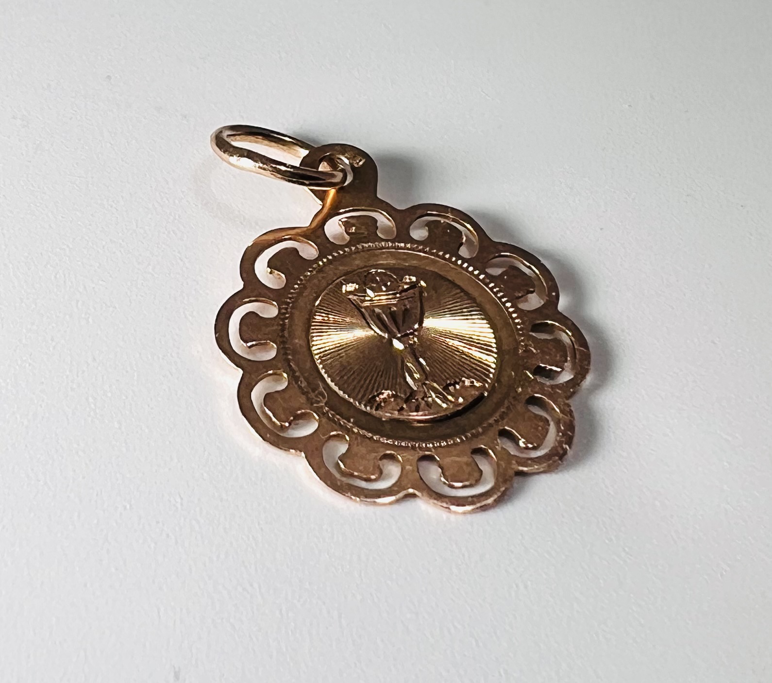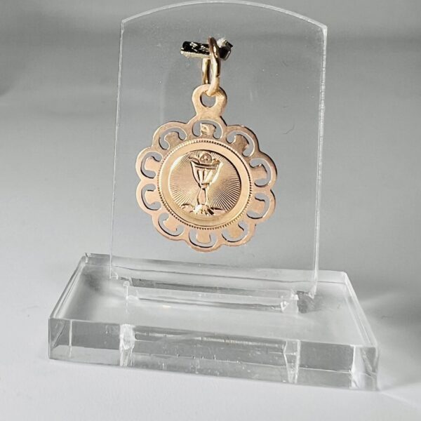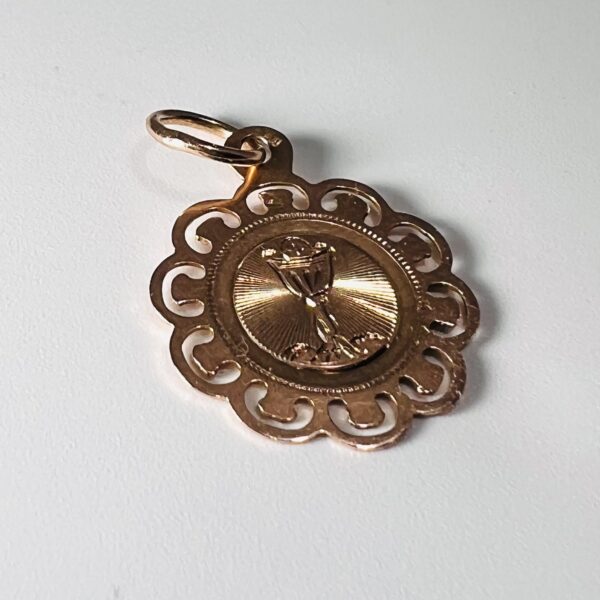 Petite médaille en or 18 carats légèrement rose, représentant un calice dans un entourage ajouré. Diamètre : 17 mm. Poids : 1 g.