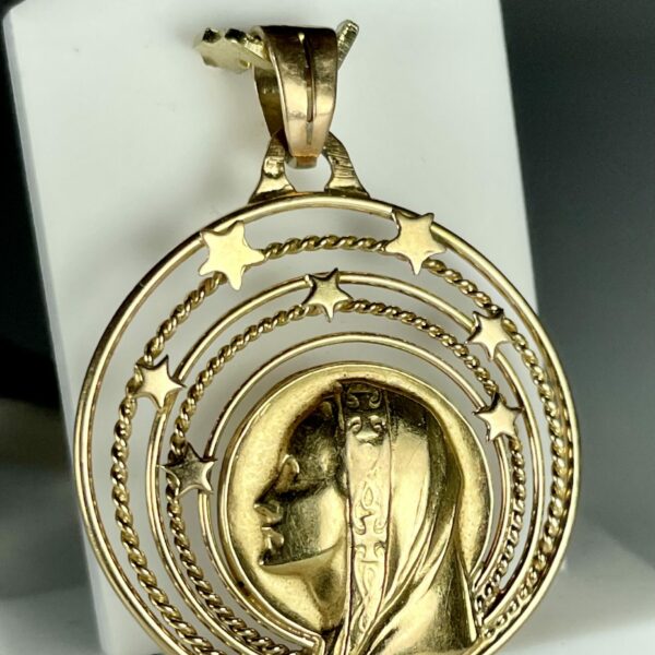 Grande médaille en or 18 carats, représentant la Vierge au voile, dans un entourage ajouré parsemé d’étoiles.